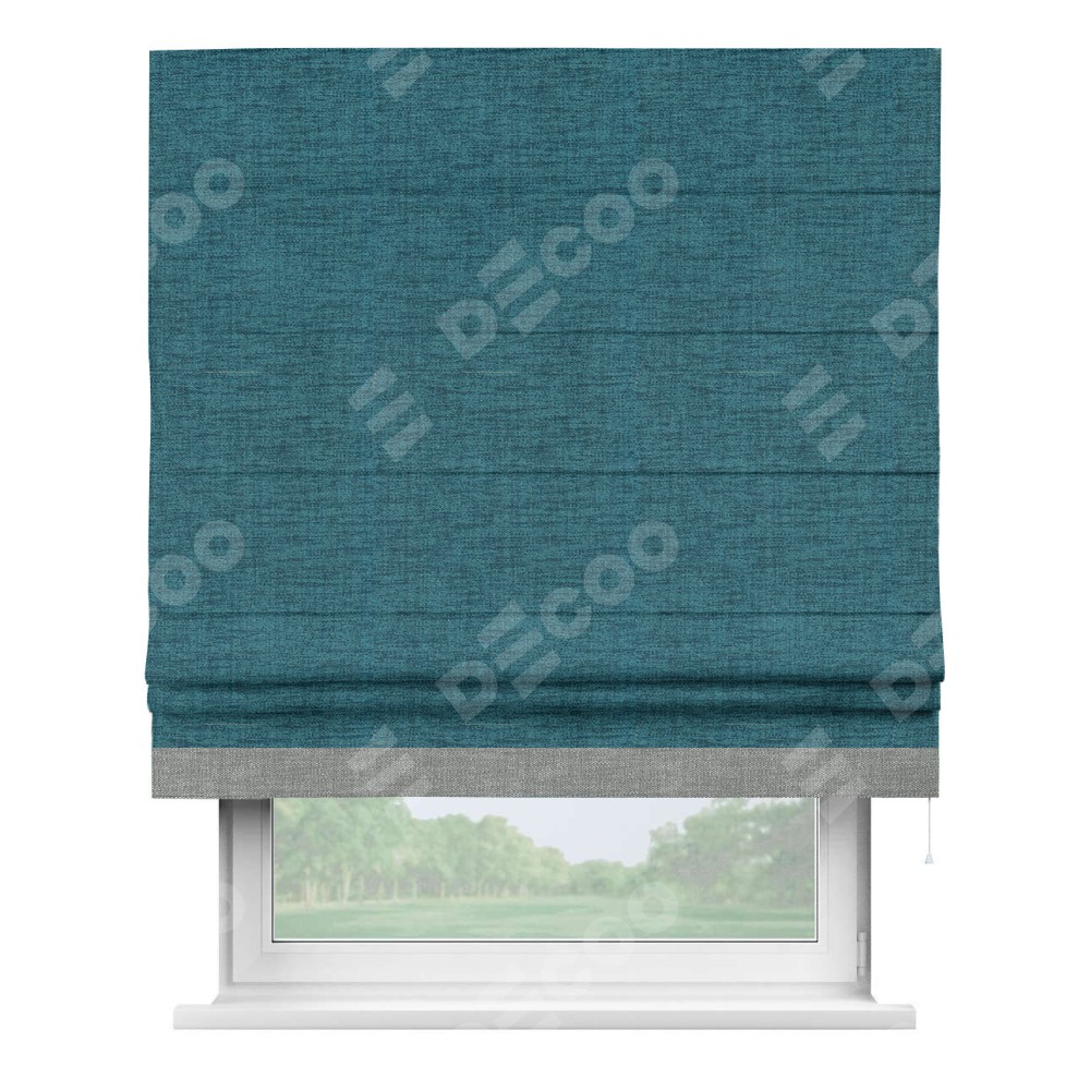 Римская штора производителя «Cortin», используется для проёма, пошита из ткани рогожка димаут синий, артикул 80422. Отделка шторы кантом «Джестер», ткань для канта используется из рогожки димаут разной расцветки на выбор. Имеет универсальный механизм и подходит для монтажа: на потолок, на стену и в нишу.