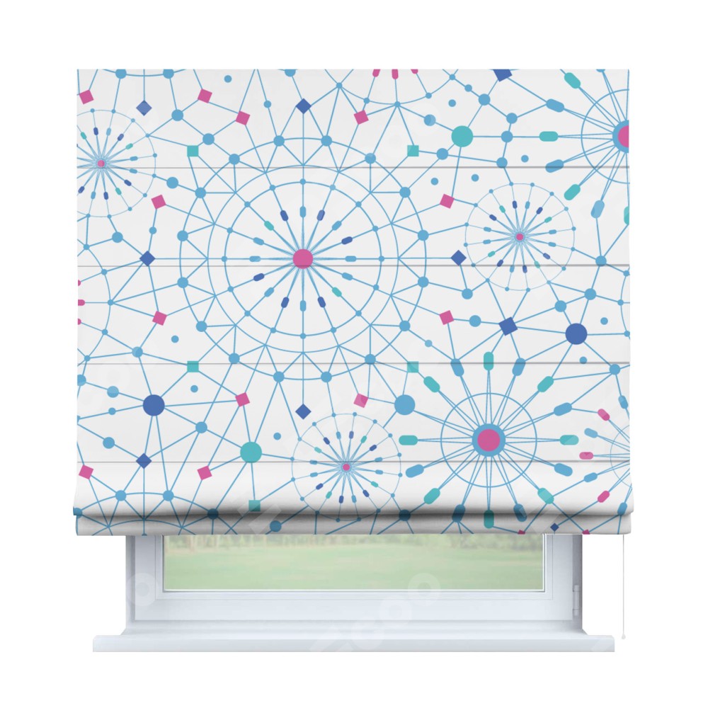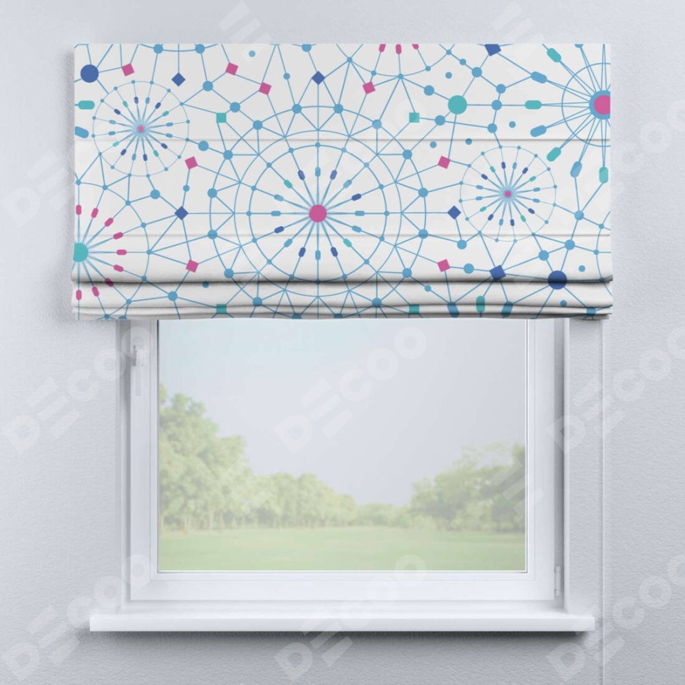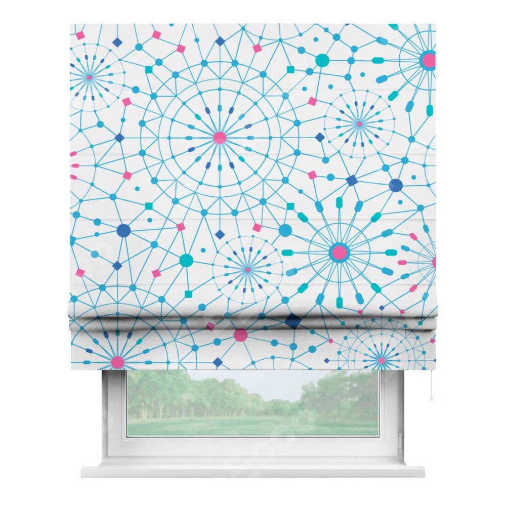 Римская штора производителя «Cortin», используется для проёма, пошита из ткани блэкаут с нанесением сублимационной печати «Круги и линии». Имеет универсальный механизм и подходит для монтажа: на потолок, на стену и в нишу.
