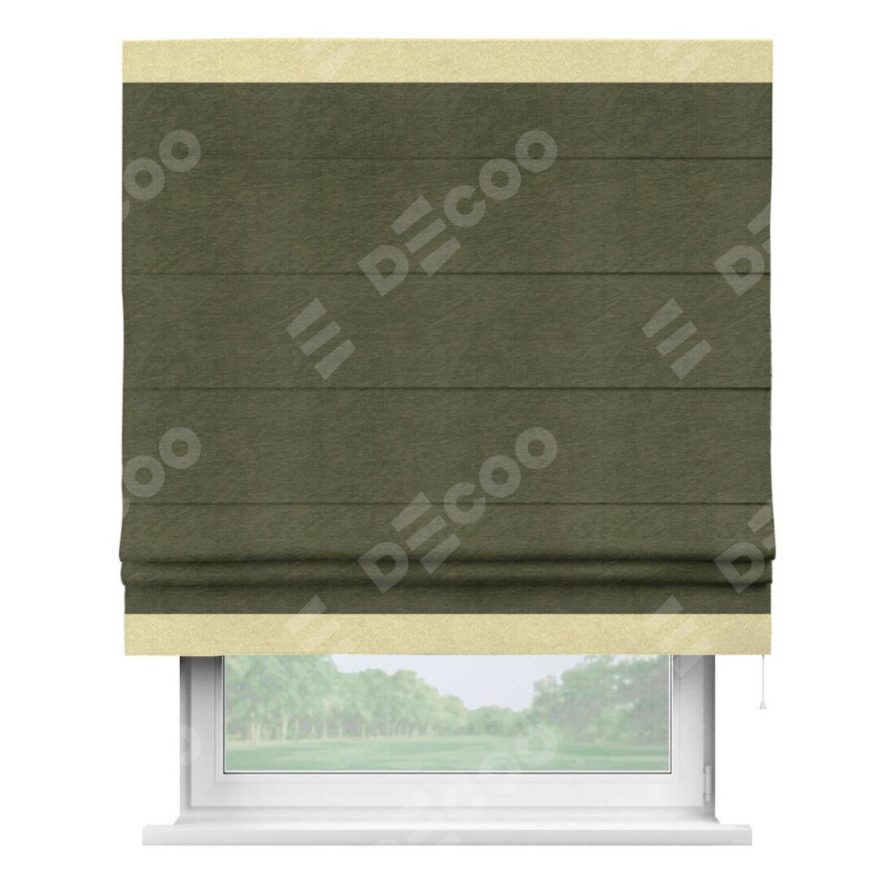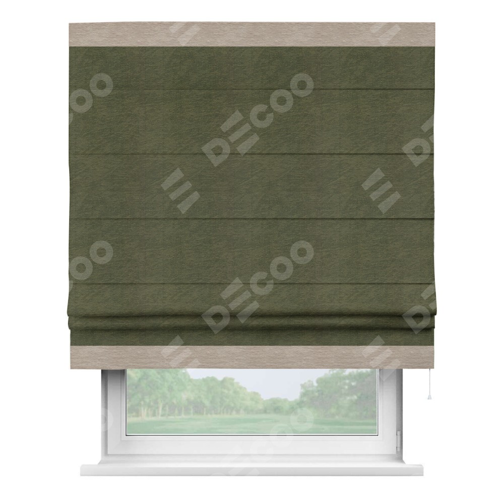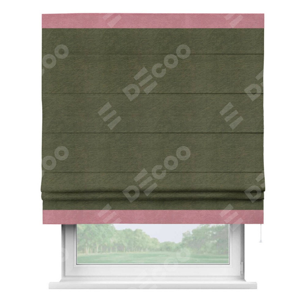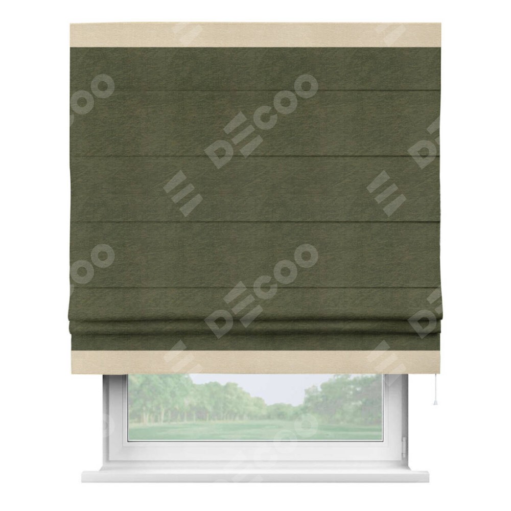 Римская штора производителя «Cortin», используется для проёма, пошита из ткани софт однотонный зелёный, артикул 33110. Отделка шторы кантом «Горизонт», ткань для канта используется из софта разной расцветки на выбор. Имеет универсальный механизм и подходит для монтажа: на потолок, на стену и в нишу.