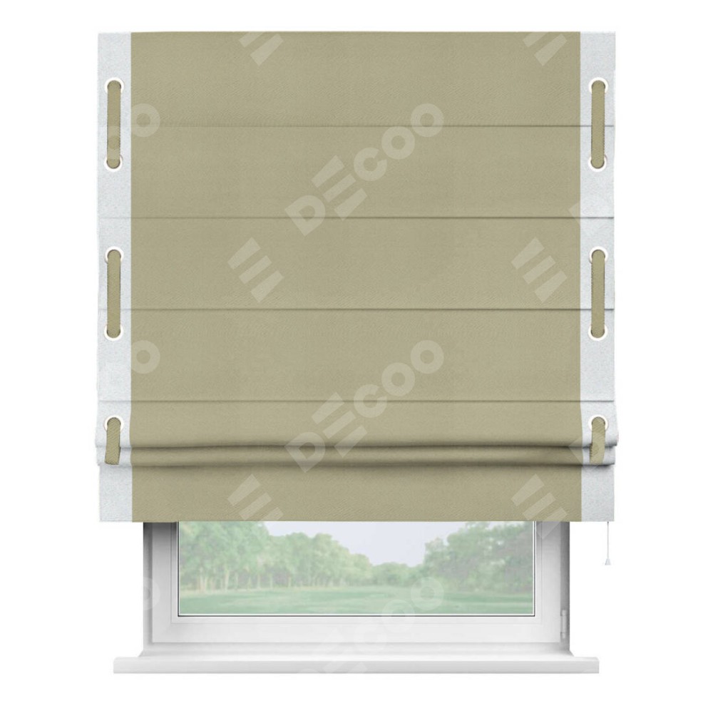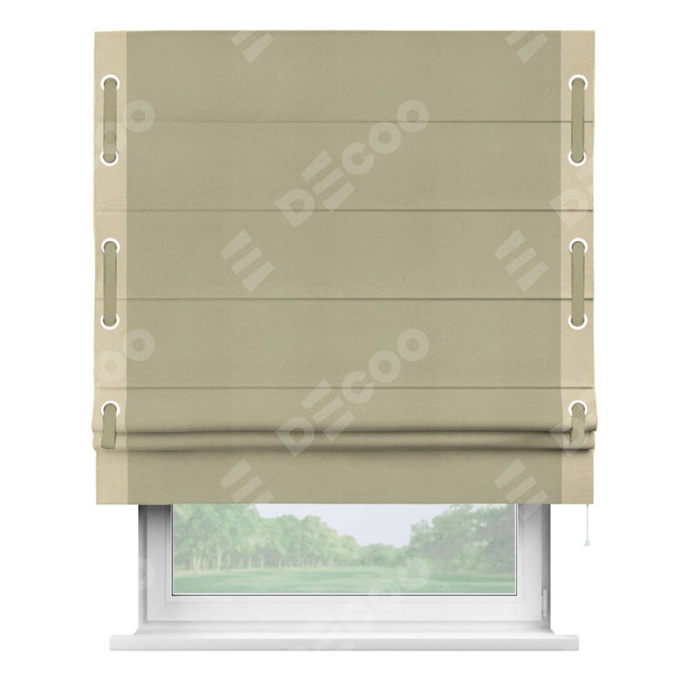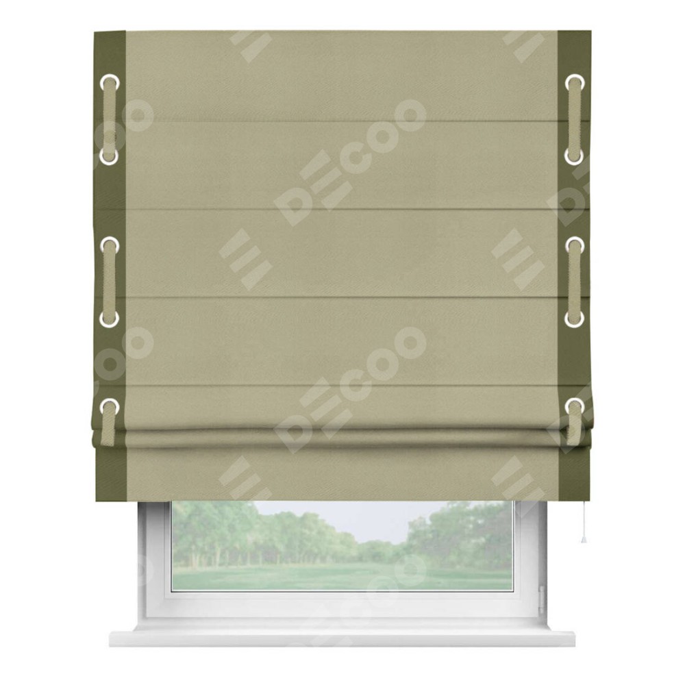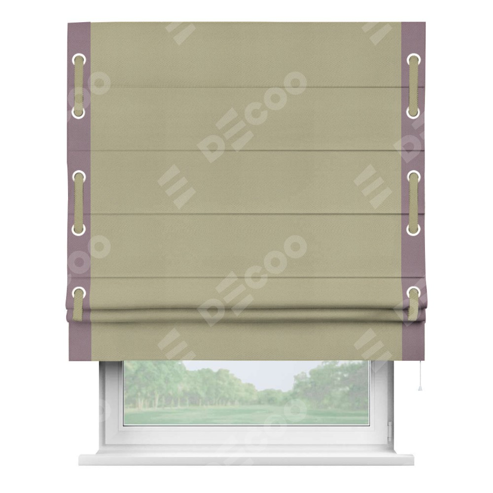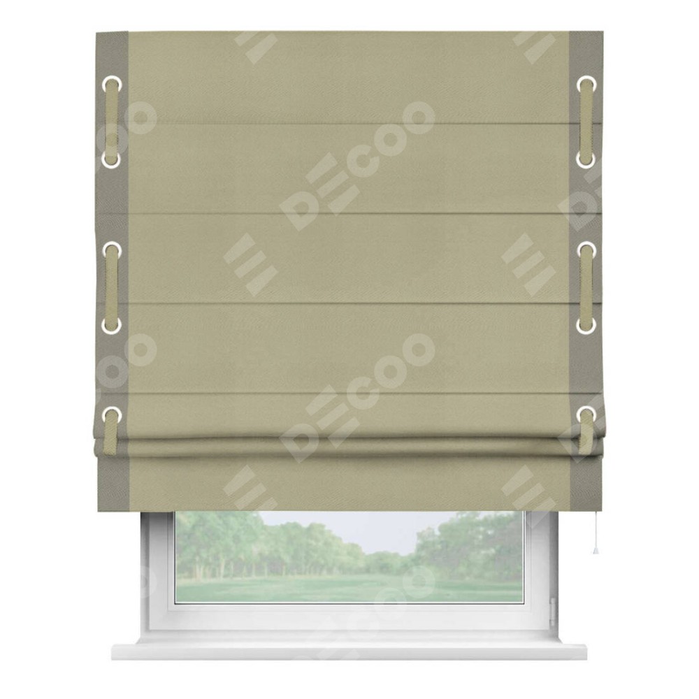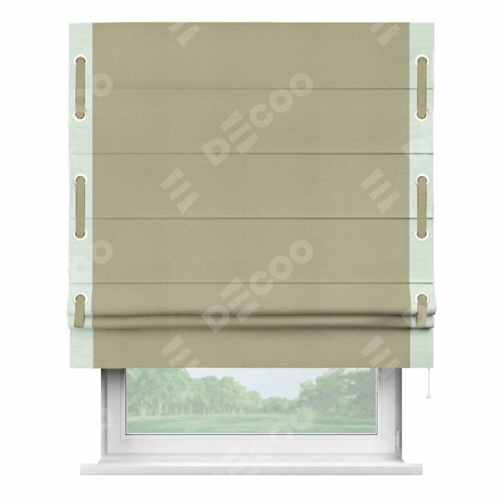 Римская штора производителя «Cortin», используется для проёма, пошита из ткани блэкаут однотонный милано капучино, артикул ткани 06. Отделка шторы кантом «Стрим Дуо» на кантах расположены люверсы с пояском, ткань для канта используется из блэкаута однотонного разной расцветки на выбор. Ткань для пояска обычно используется из основной ткани шторы, а так же можно сделать из любой расцветки по желанию. Имеет универсальный механизм и подходит для монтажа: на потолок, на стену и в нишу.