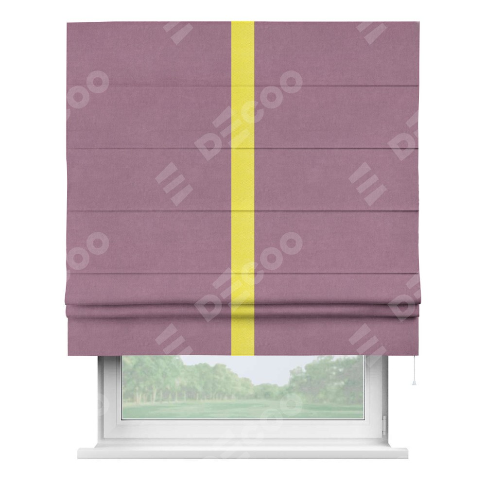 Римская штора производителя «Cortin», используется для проёма, пошита из ткани вельвет лиловый, артикул ткани 17752. Отделка шторы кантом «Хайвей», ткань для канта используется из вельвета разной расцветки на выбор. Имеет универсальный механизм и подходит для монтажа: на потолок, на стену и в нишу.