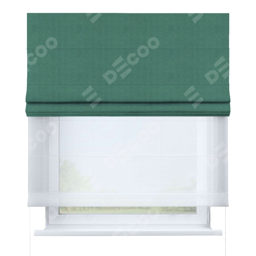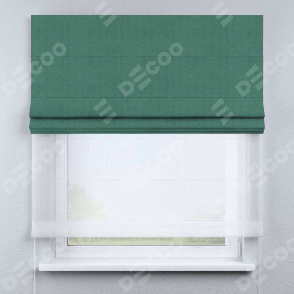 Римская штора день-ночь производителя «Cortin», используется для проёма, пошита из двух полотен, с лицевой стороны блэкаут тиснение с блеском изумрудный артикул 34628, вторая ткань тюль (по стандарту комплектуется тюль белого цвета артикул V-01). Изнаночная сторона основного материала черного цвета, что обеспечивает необходимую светонепроницаемость. Имеет универсальный механизм и подходит для монтажа: на потолок, на стену и в нишу.