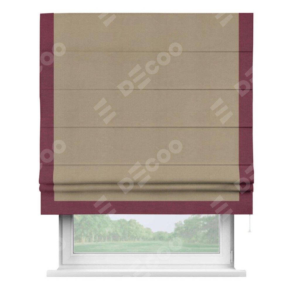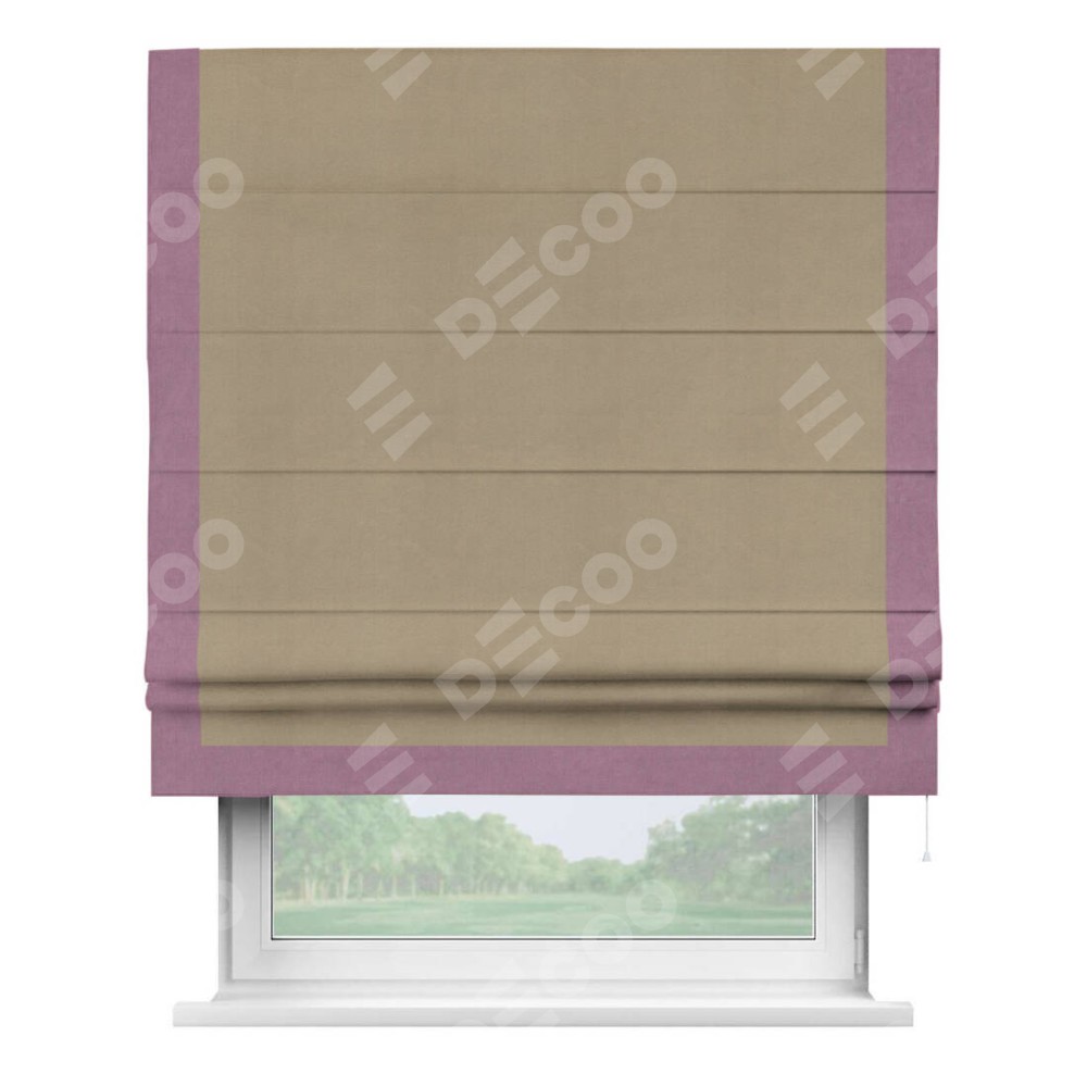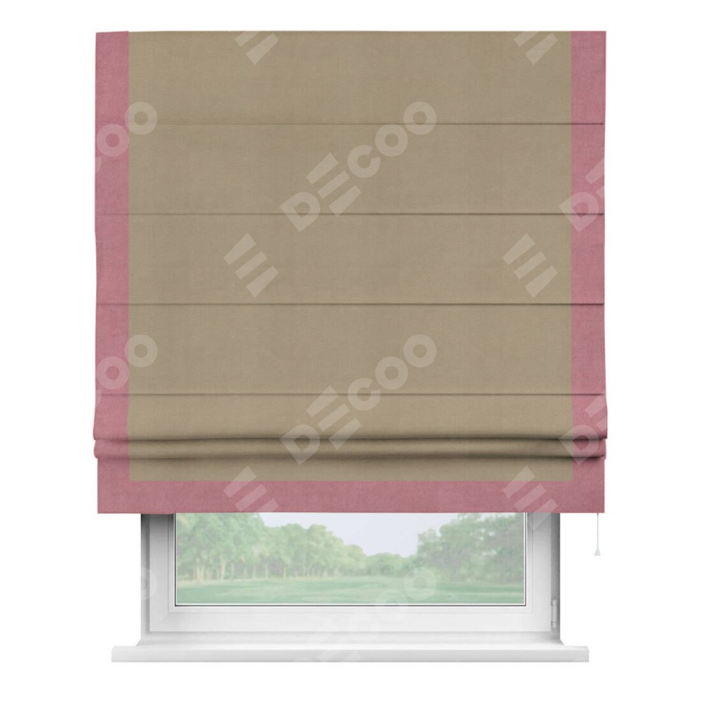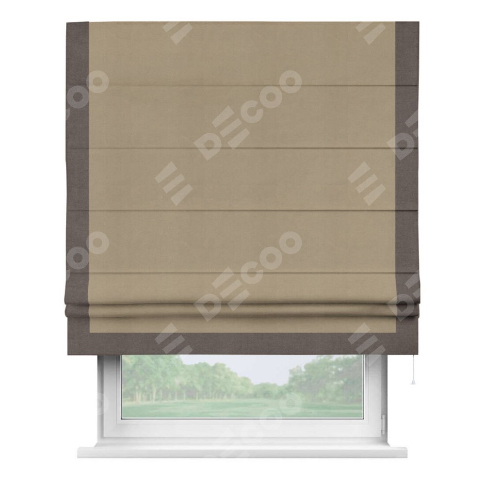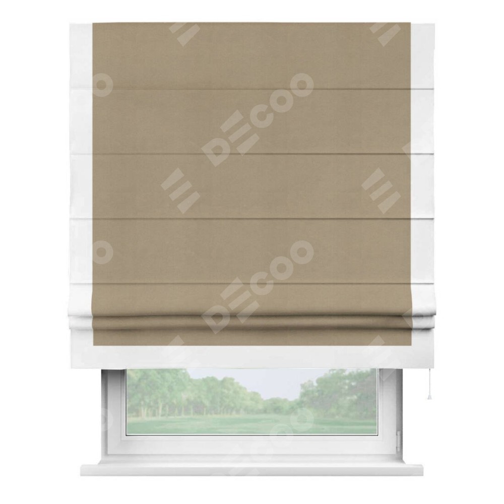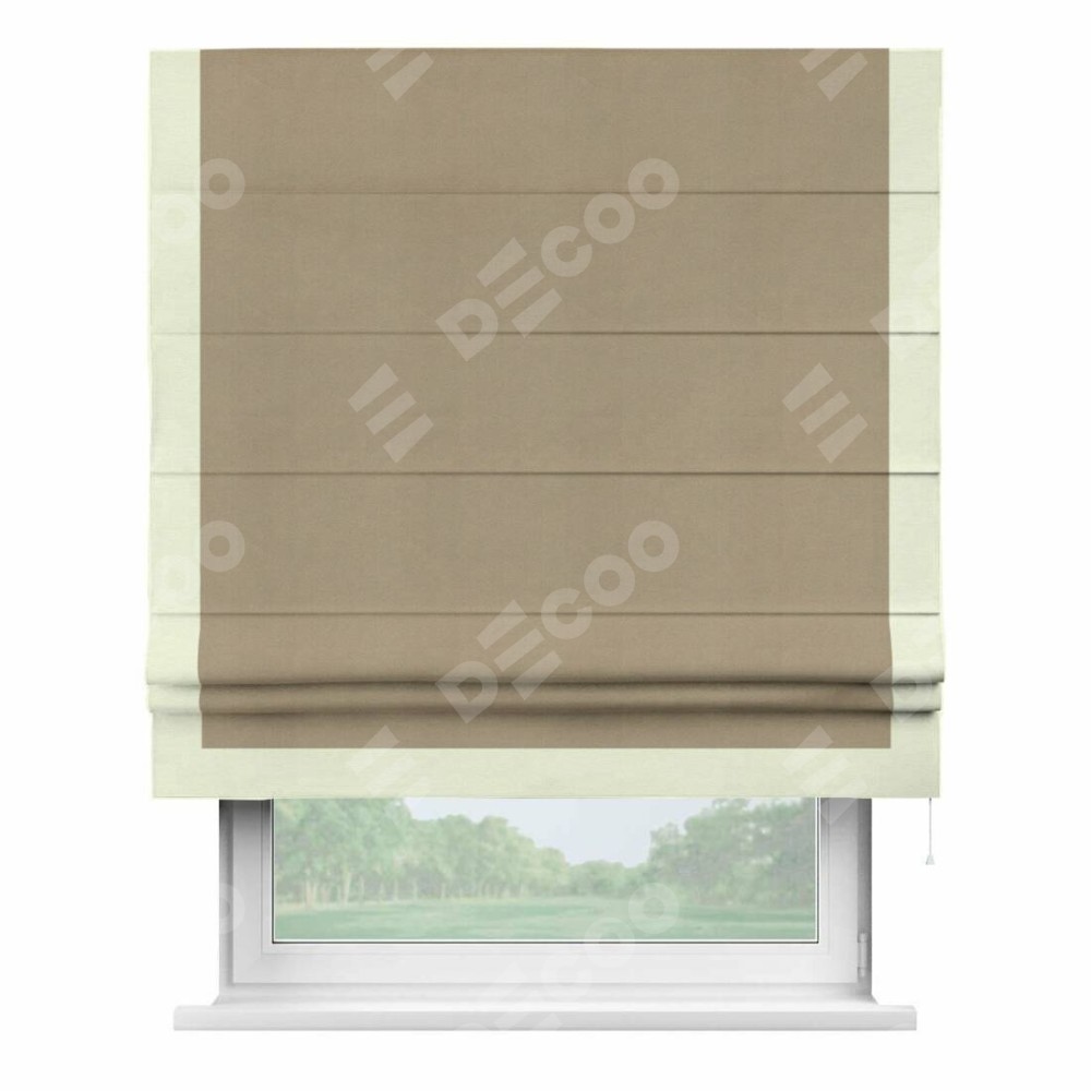 Римская штора производителя «Cortin», используется для проёма, пошита из ткани вельвет кофейный, артикул ткани 30980. Отделка шторы кантом «Виктория», ткань для канта используется из вельвета разной расцветки на выбор. Имеет универсальный механизм и подходит для монтажа: на потолок, на стену и в нишу.