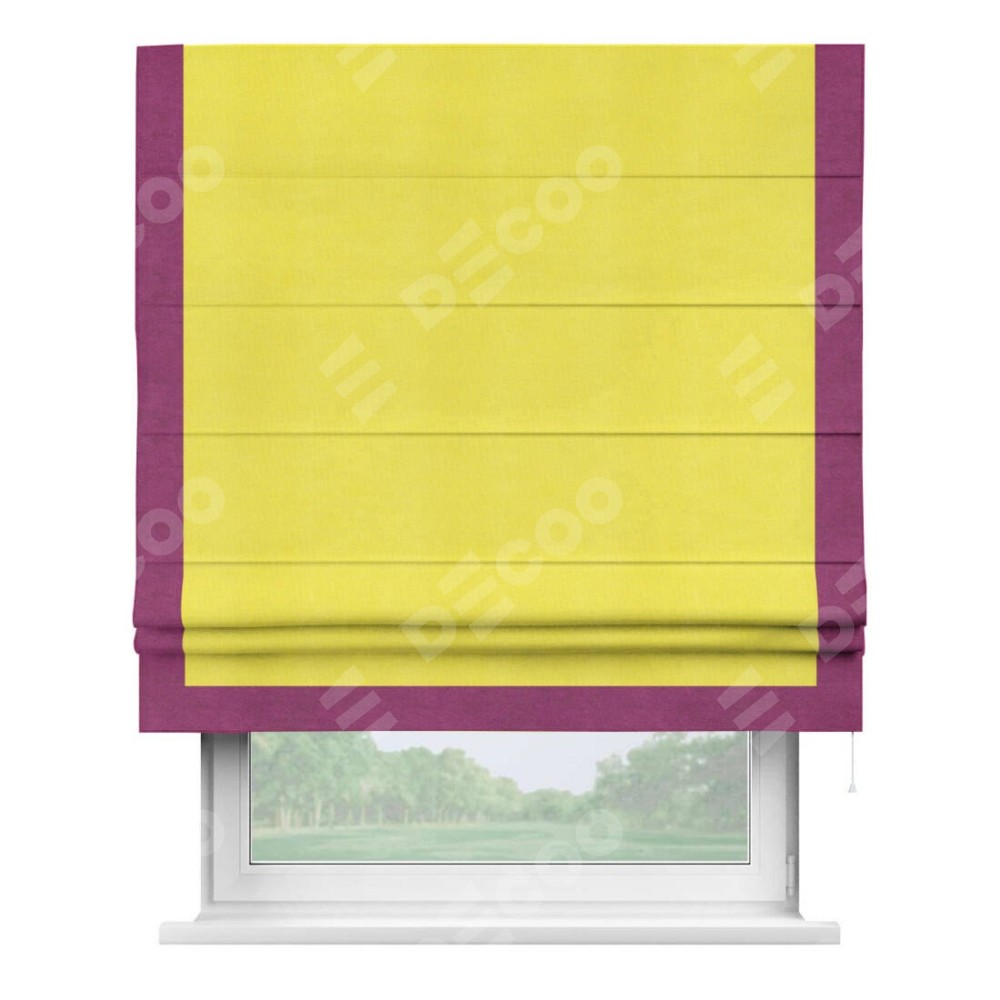 Римская штора производителя «Cortin», используется для проёма, пошита из ткани вельвет cветло-желтый, артикул ткани 30997. Отделка шторы кантом «Виктория», ткань для канта используется из вельвета разной расцветки на выбор. Имеет универсальный механизм и подходит для монтажа: на потолок, на стену и в нишу.
