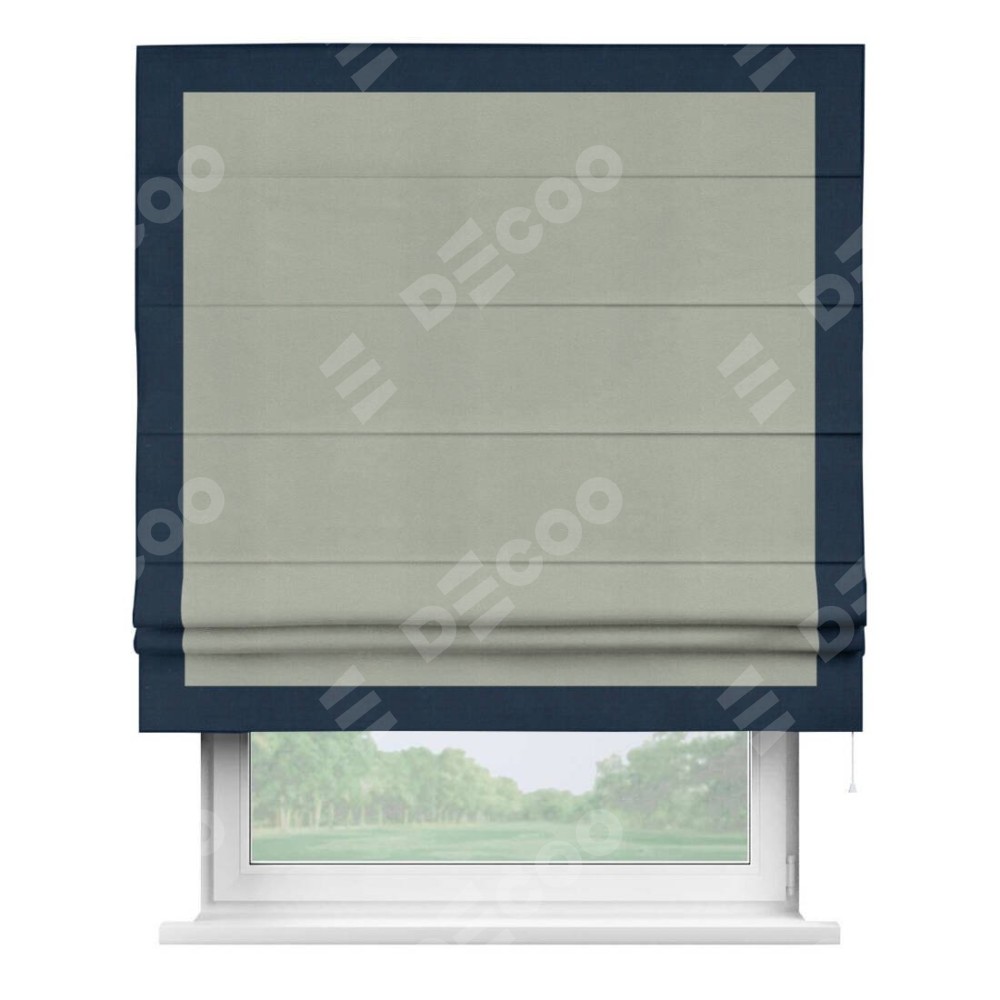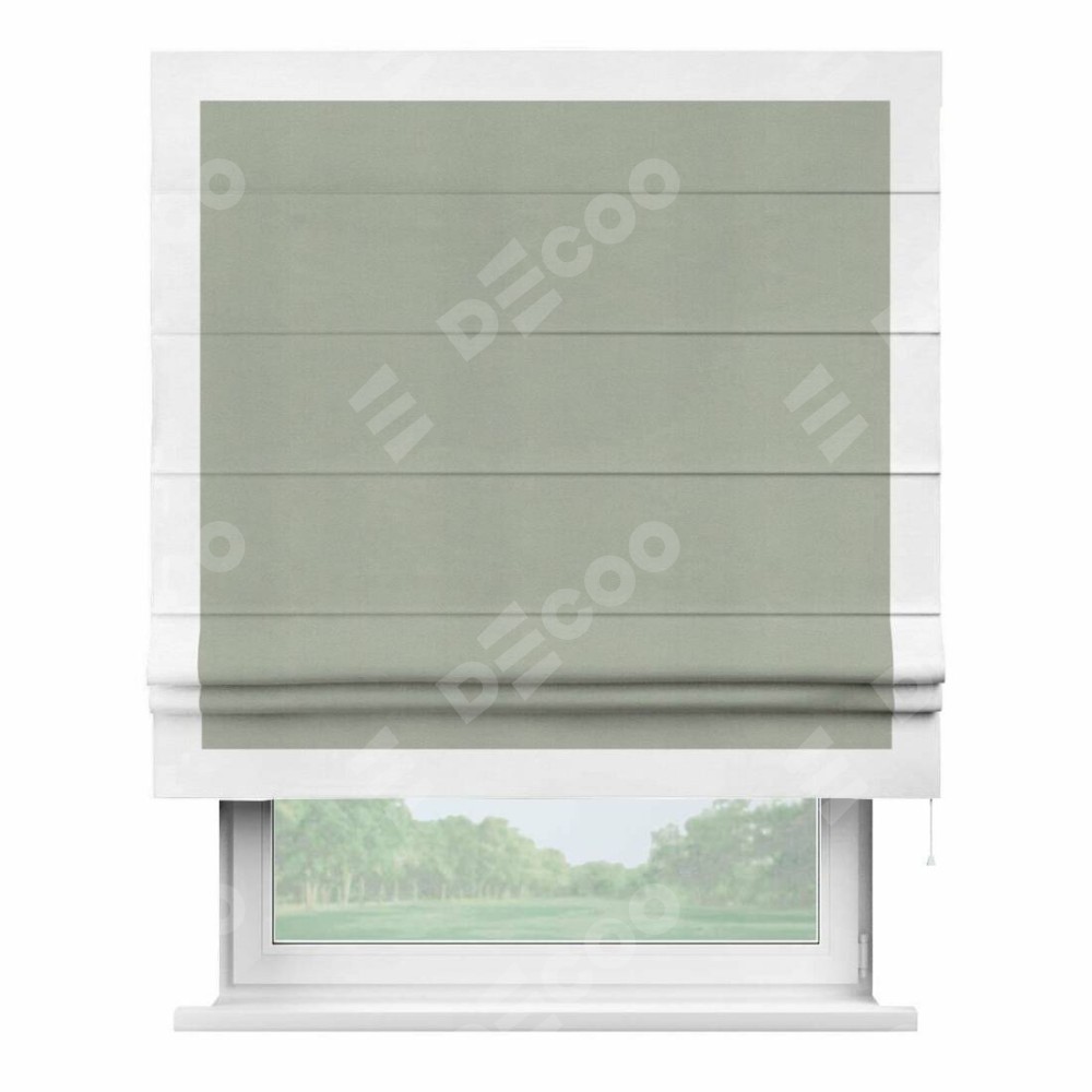 Римская штора производителя «Cortin», используется для проёма, пошита из ткани вельвет cветло-серый, артикул ткани 30980. Отделка шторы кантом «Чесс», ткань для канта используется из вельвета разной расцветки на выбор. Имеет универсальный механизм и подходит для монтажа: на потолок, на стену и в нишу.