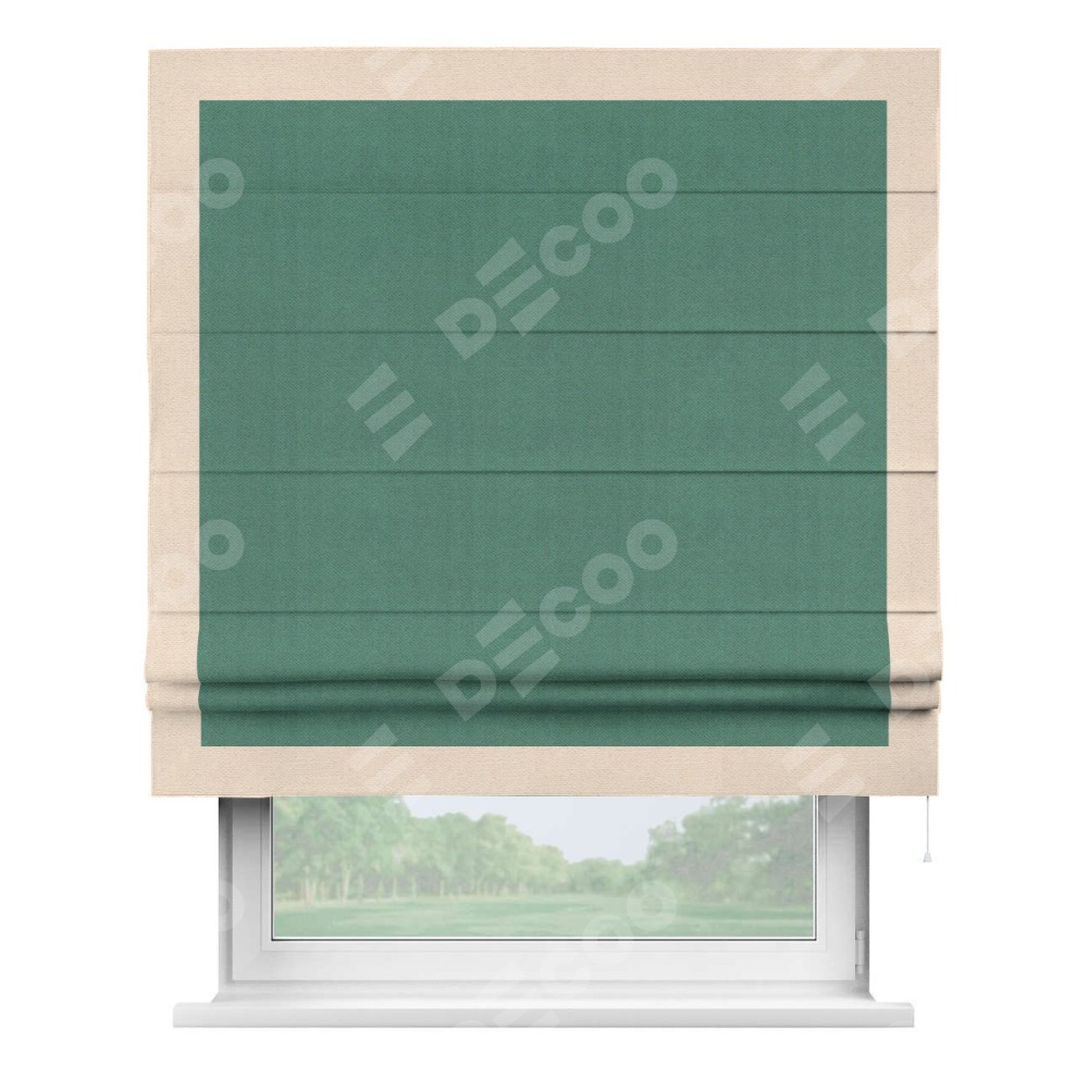 Римская штора производителя «Cortin», используется для проёма, пошита из ткани блэкаут с блеском изумрудный, артикул 34628. Отделка шторы кантом «Чесс», ткань для канта используется из блэкаута с блеском разной расцветки на выбор. Изнаночная сторона материала черного цвета, что обеспечивает необходимую светонепроницаемость. Имеет универсальный механизм и подходит для монтажа: на потолок, на стену и в нишу.