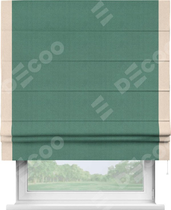 Римская штора производителя «Cortin», используется для проёма, пошита из ткани блэкаут с блеском изумрудный, артикул 34628. Отделка шторы кантом «Стрим Дуо», ткань для канта используется из блэкаута с блеском разной расцветки на выбор. Изнаночная сторона материала черного цвета, что обеспечивает необходимую светонепроницаемость. Имеет универсальный механизм и подходит для монтажа: на потолок, на стену и в нишу.