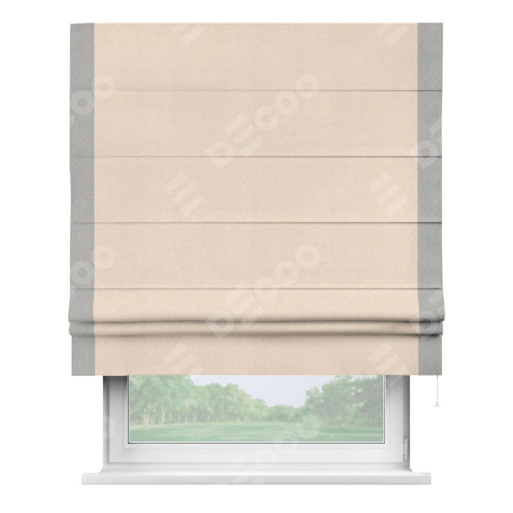 Римская штора производителя «Cortin», используется для проёма, пошита из ткани блэкаут с блеском розовая пудра, артикул 34632. Отделка шторы кантом «Стрим Дуо», ткань для канта используется из блэкаута с блеском разной расцветки на выбор. Изнаночная сторона материала черного цвета, что обеспечивает необходимую светонепроницаемость. Имеет универсальный механизм и подходит для монтажа: на потолок, на стену и в нишу.
