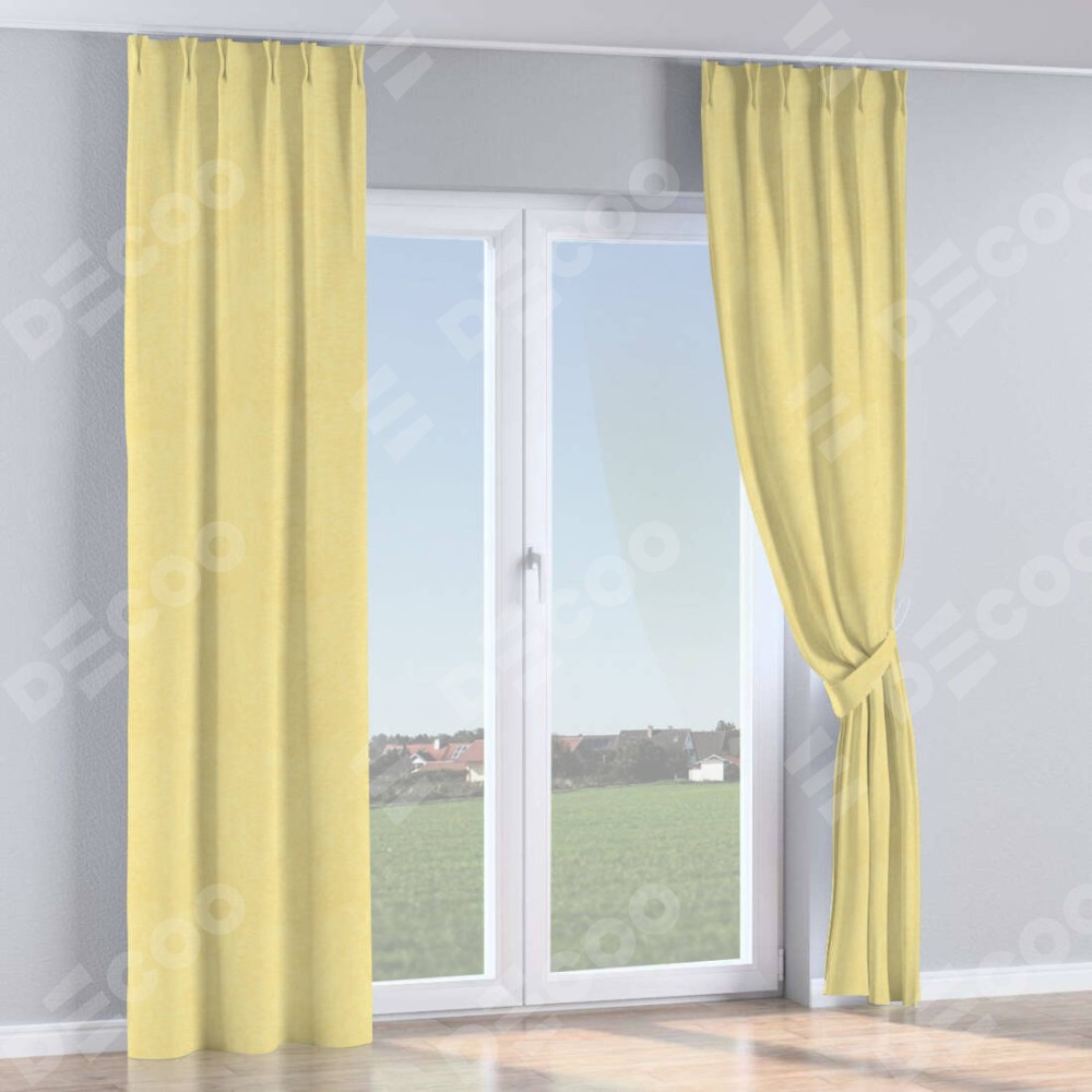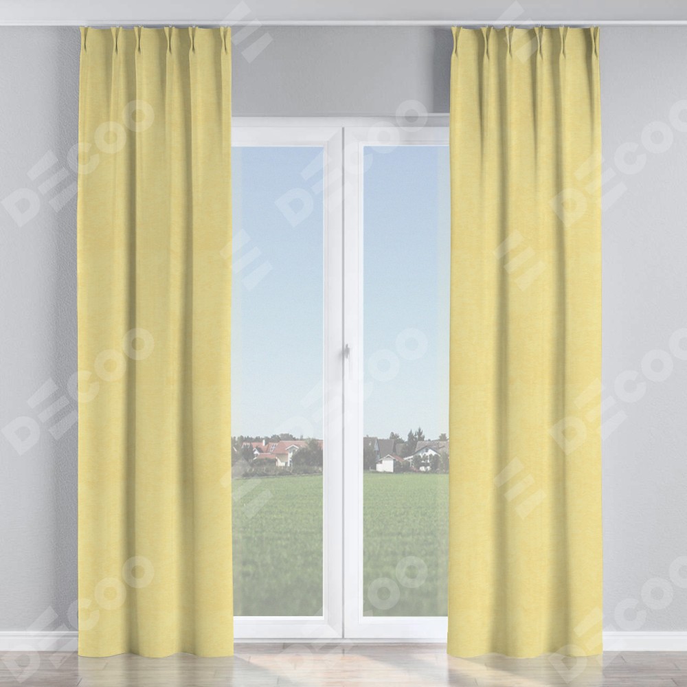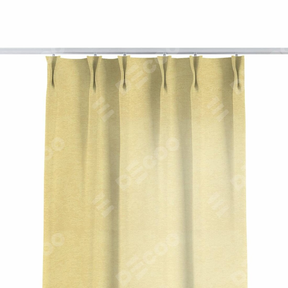 Комплект прямых штор, от производителя «Cortin», пошиты из ткани софт однотонный золотой, артикул ткани 42934. С изнаночной стороны в верхней части штор пристрачивается шторная лента с декоративными складками «Кустик». Для создания элегантных складок прямые шторы шьются по стандарту с коэффициентом 1:2 (на 100 см. ширины проёма 200 см. ширины ткани).