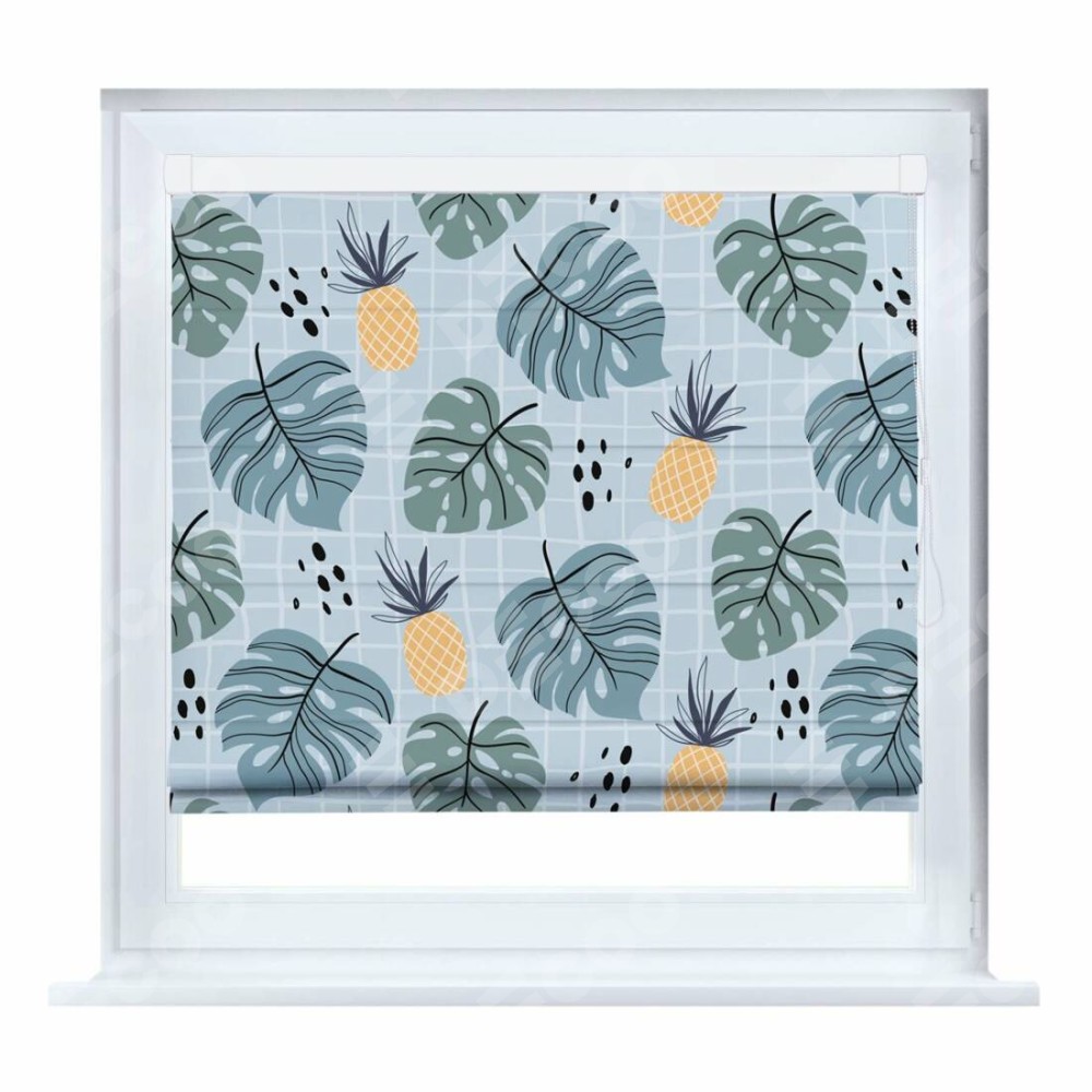 Римская штора производителя «Cortin», устанавливается на створку окна, пошита из ткани блэкаут с нанесением сублимационной печати «Ананасы и листья монстеры». Штора шьётся по индивидуальным размерам, для данного типа римской шторы возможная ширина от 35 до 150 см., высота до 250 см.