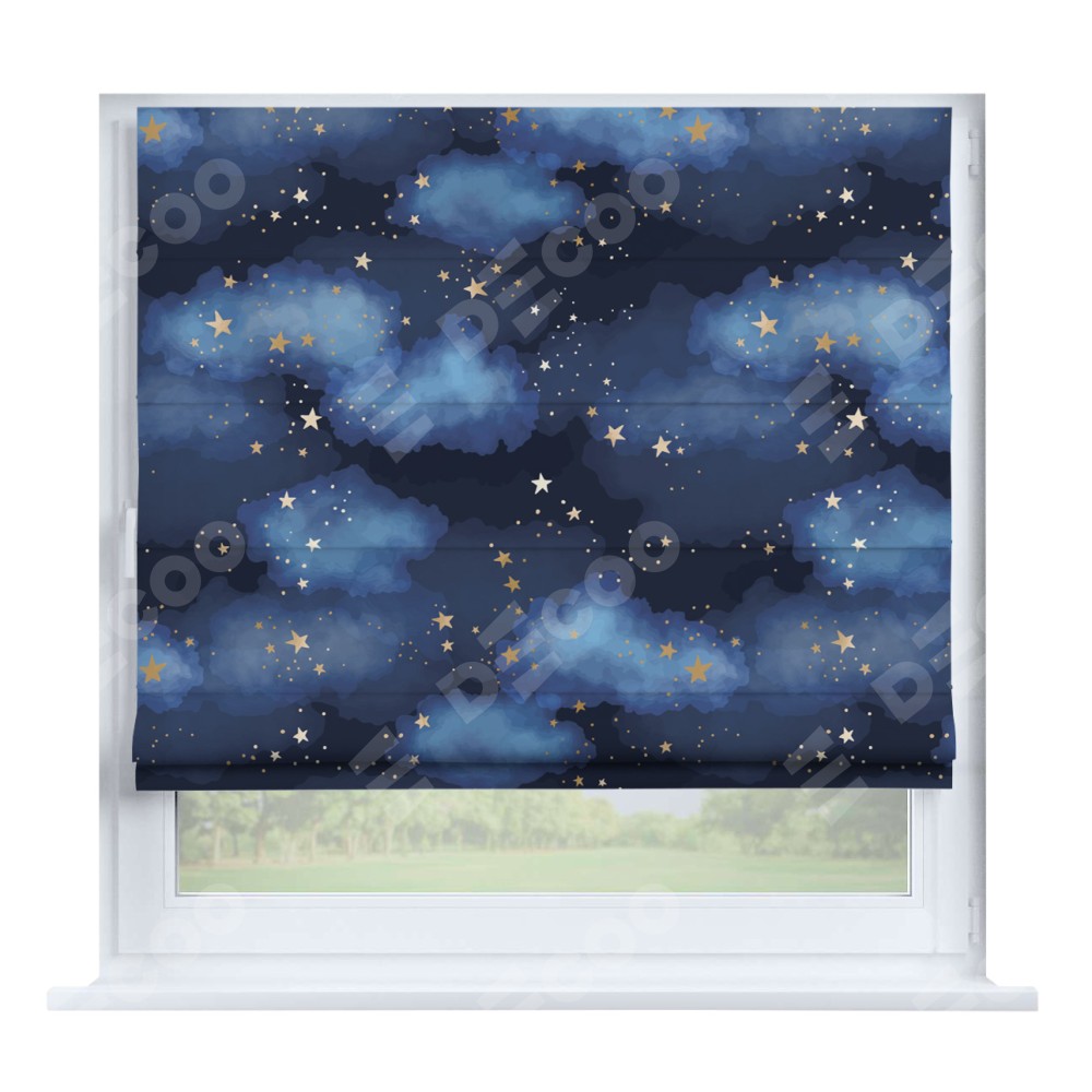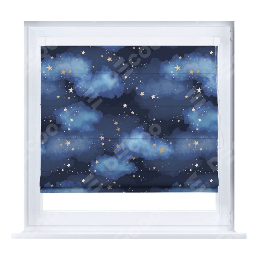 Римская штора производителя «Cortin», устанавливается на створку окна, пошита из ткани блэкаут с нанесением сублимационной печати «Золотые звёзды». Штора шьётся по индивидуальным размерам, для данного типа римской шторы возможная ширина от 35 до 150 см., высота до 250 см.