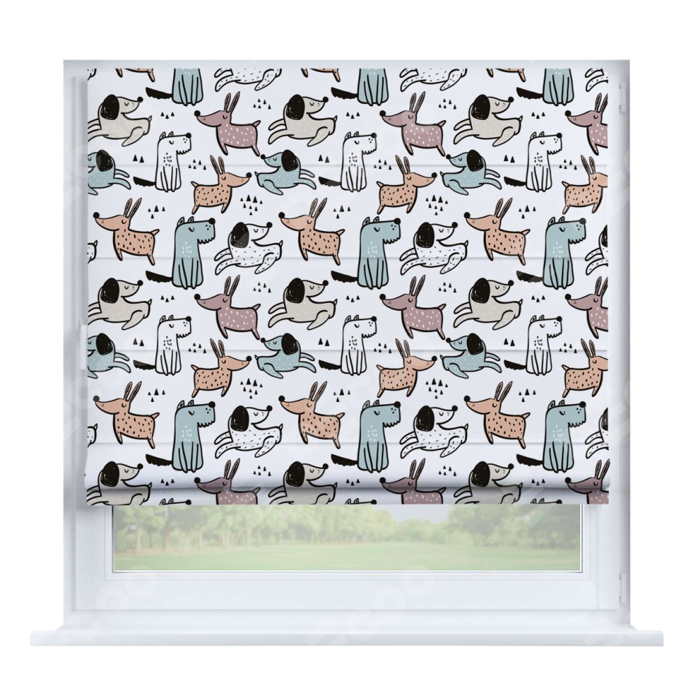 Римская штора производителя «Cortin», устанавливается на створку окна, пошита из ткани блэкаут с нанесением сублимационной печати «Очаровательные щеночки». Штора шьётся по индивидуальным размерам, для данного типа римской шторы возможная ширина от 35 до 150 см., высота до 250 см.