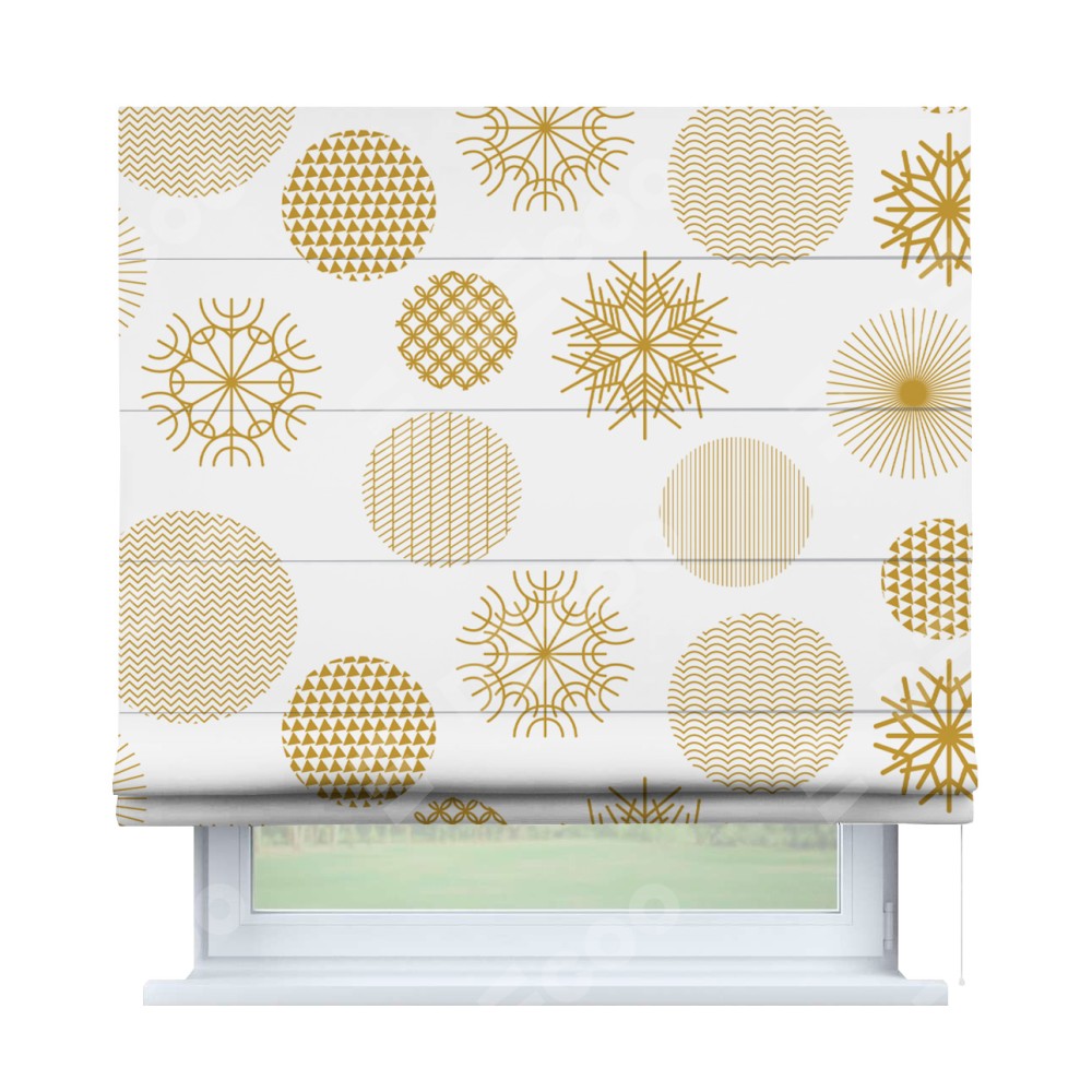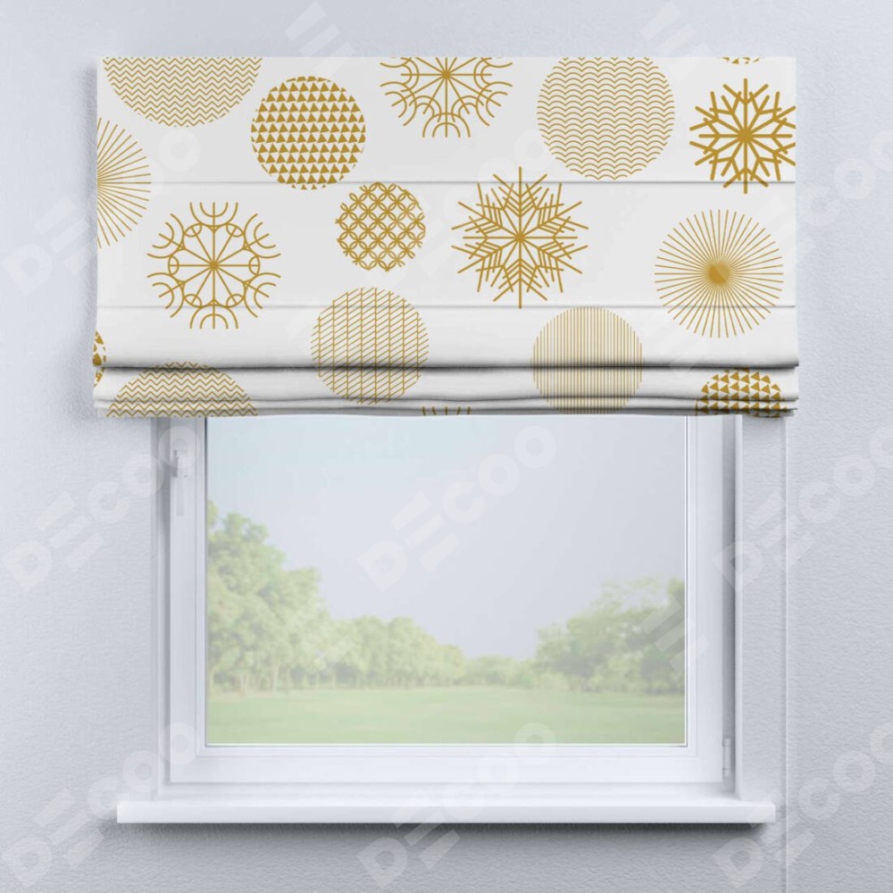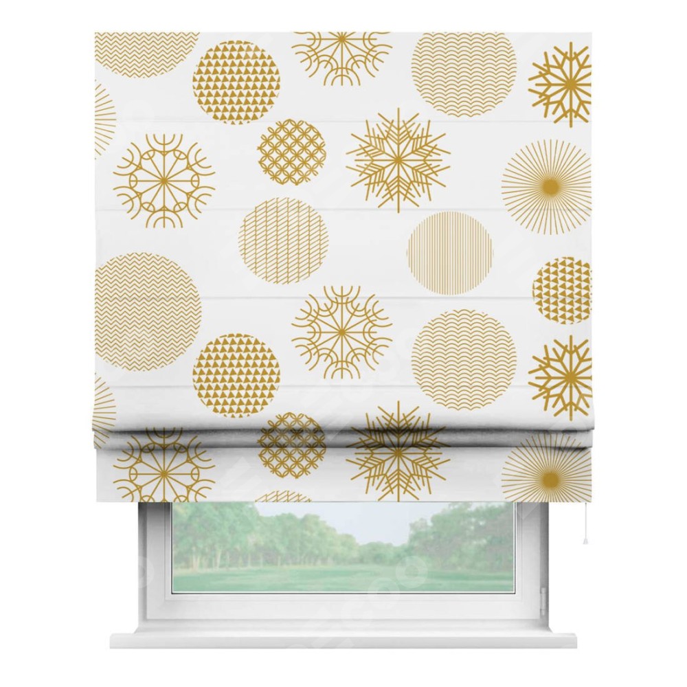 Римская штора производителя «Cortin», используется для проёма, пошита из ткани блэкаут с нанесением сублимационной печати «Золотые шары». Имеет универсальный механизм и подходит для монтажа: на потолок, на стену и в нишу.