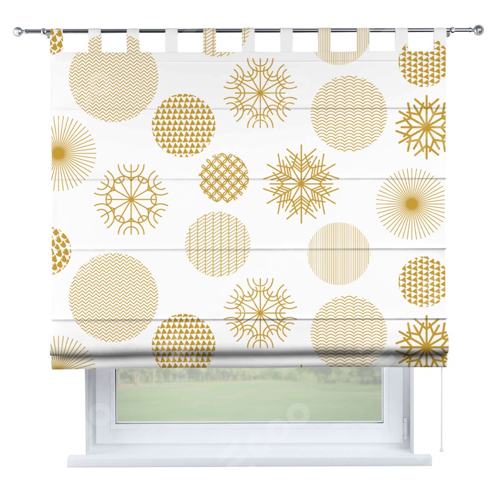 Римская штора производителя «Cortin», используется для проёма, пошита из ткани блэкаут с нанесением сублимационной печати «Золотые шары». Данная модель пошита на петлях, комплектуется на выбор круглым карнизом и подходит для монтажа на стену. Римская штора на петлях имеет простую систему регулировки высоты, отличительным преимуществом данной модели является простой способ монтажа. Достаточно повесить ее на трубу и штора готова!