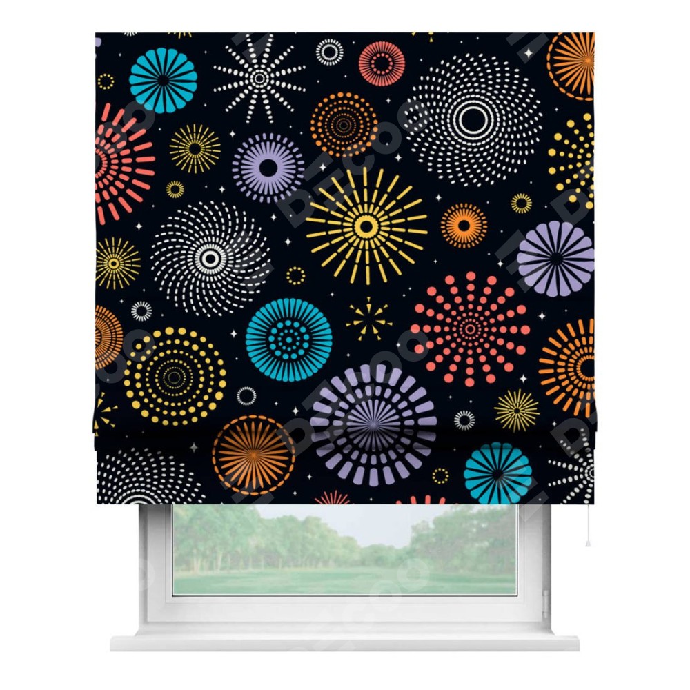 Римская штора производителя «Cortin», используется для проёма, пошита из ткани блэкаут с нанесением сублимационной печати «Праздничный фейерверк». Имеет универсальный механизм и подходит для монтажа: на потолок, на стену и в нишу.