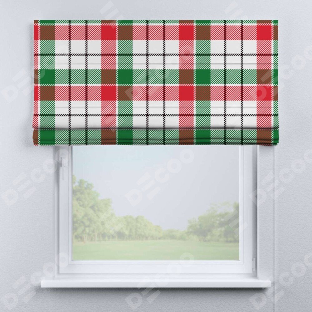 Римская штора производителя «Cortin», используется для проёма, пошита из ткани блэкаут с нанесением сублимационной печати «Трёхцветная клетка». Имеет универсальный механизм и подходит для монтажа: на потолок, на стену и в нишу.