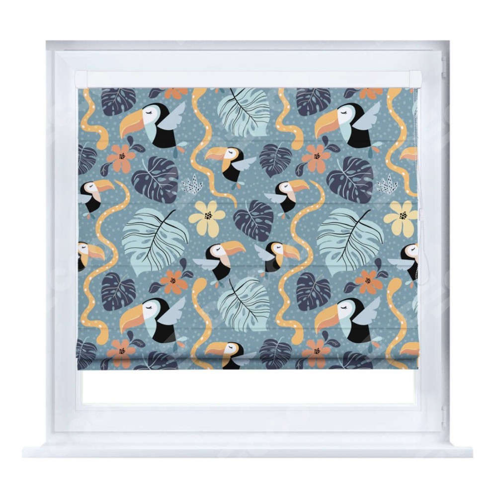 Римская штора производителя «Cortin», устанавливается на створку окна, пошита из ткани блэкаут с нанесением сублимационной печати «Экзотические птицы». Штора шьётся по индивидуальным размерам, для данного типа римской шторы возможная ширина от 35 до 150 см., высота до 250 см.