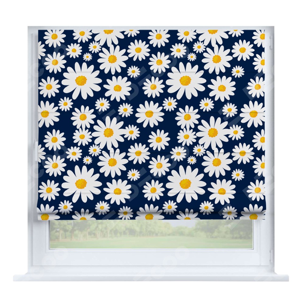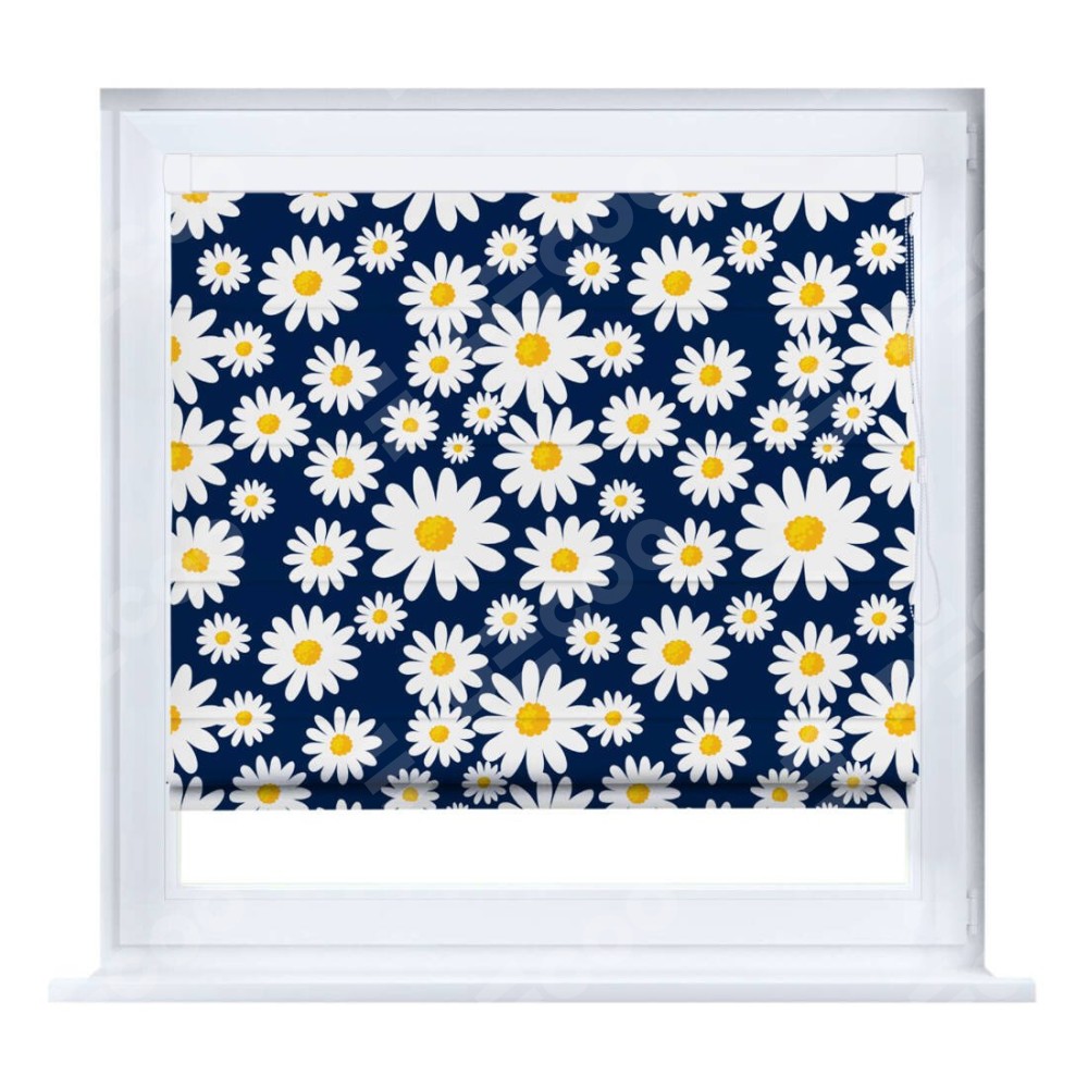 Римская штора производителя «Cortin», устанавливается на створку окна, пошита из ткани блэкаут с нанесением сублимационной печати «Яркие ромашки». Штора шьётся по индивидуальным размерам, для данного типа римской шторы возможная ширина от 35 до 150 см., высота до 250 см.