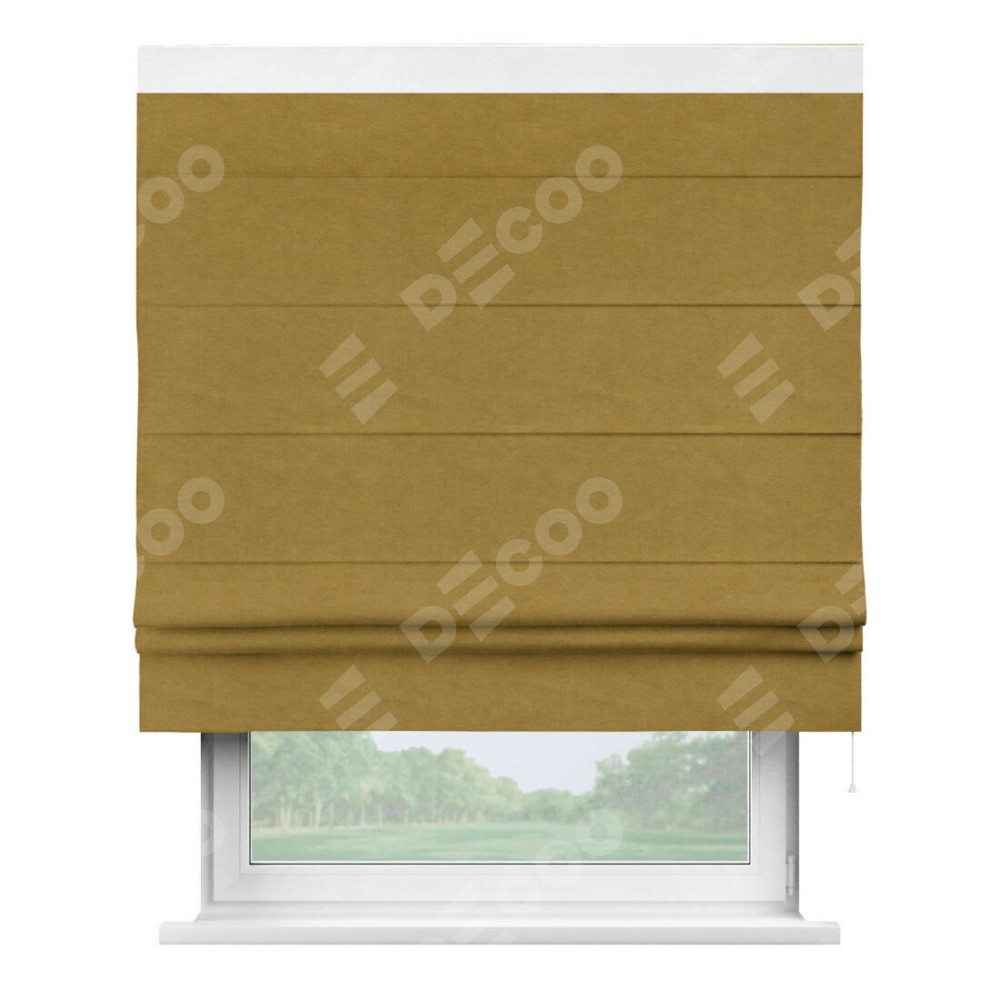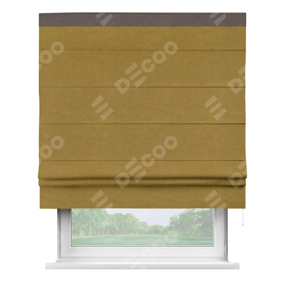 Римская штора производителя «Cortin», используется для проёма, пошита из ткани вельвет светло-коричневый, артикул ткани 4973. Отделка шторы кантом «Кинг», ткань для канта используется из вельвета разной расцветки на выбор. Имеет универсальный механизм и подходит для монтажа: на потолок, на стену и в нишу.
