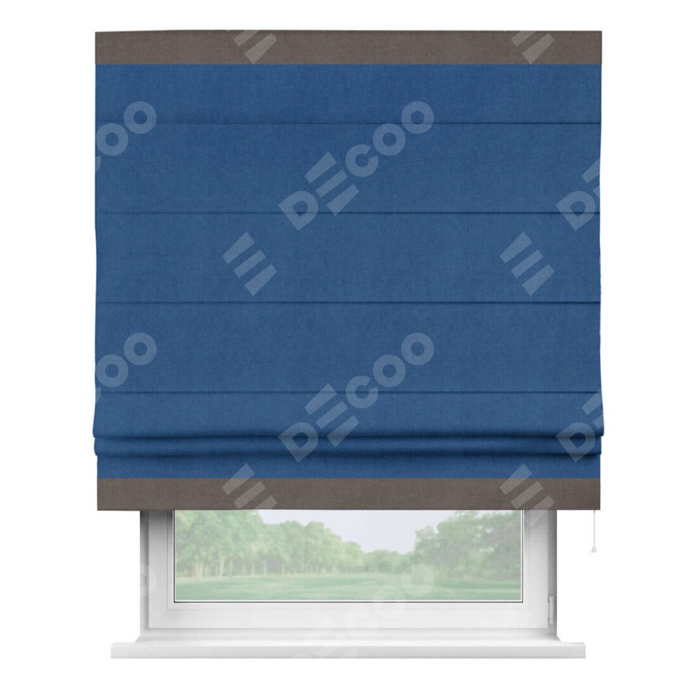 Римская штора производителя «Cortin», используется для проёма, пошита из ткани вельвет синий, артикул ткани 85554. Отделка шторы кантом «Горизонт», ткань для канта используется из вельвета разной расцветки на выбор. Имеет универсальный механизм и подходит для монтажа: на потолок, на стену и в нишу.