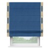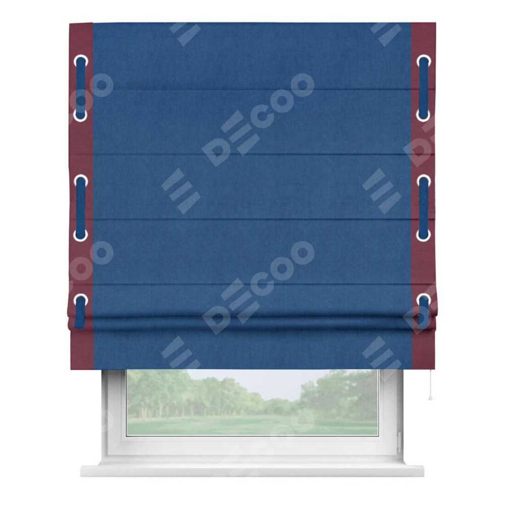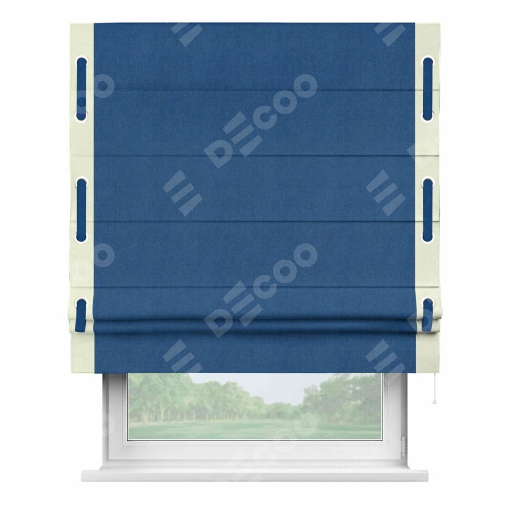 Римская штора производителя «Cortin», используется для проёма, пошита из ткани вельвет синий, артикул ткани 85554. Отделка шторы кантом «Стрим Дуо» на кантах расположены люверсы с пояском, ткань для канта используется из вельвета разной расцветки на выбор. Ткань для пояска обычно используется из основной ткани шторы, а так же можно сделать из любой расцветки по желанию. Имеет универсальный механизм и подходит для монтажа: на потолок, на стену и в нишу.