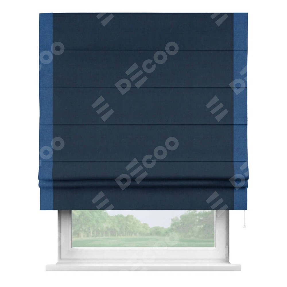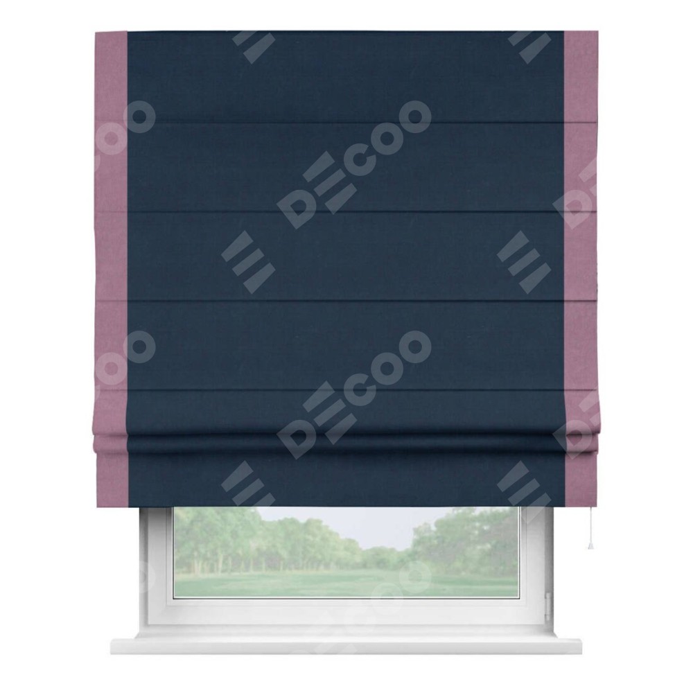 Римская штора производителя «Cortin», используется для проёма, пошита из ткани вельвет темно-синий, артикул ткани 14152. Отделка шторы кантом «Стрим Дуо», ткань для канта используется из вельвета разной расцветки на выбор. Имеет универсальный механизм и подходит для монтажа: на потолок, на стену и в нишу.