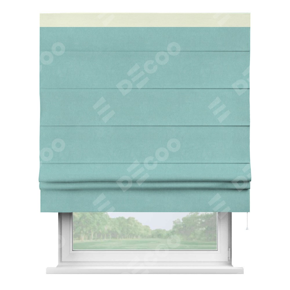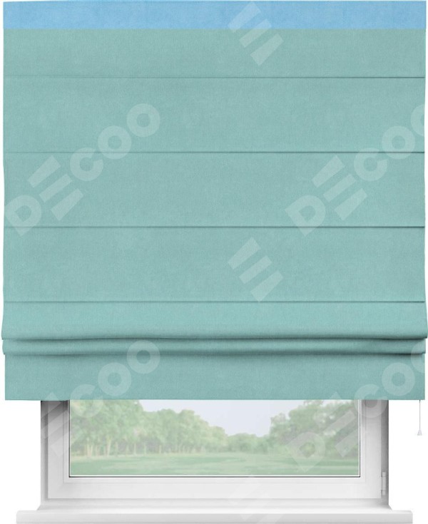 Римская штора производителя «Cortin», используется для проёма, пошита из ткани вельвет тиффани, артикул ткани 17765. Отделка шторы кантом «Кинг», ткань для канта используется из вельвета разной расцветки на выбор. Имеет универсальный механизм и подходит для монтажа: на потолок, на стену и в нишу.