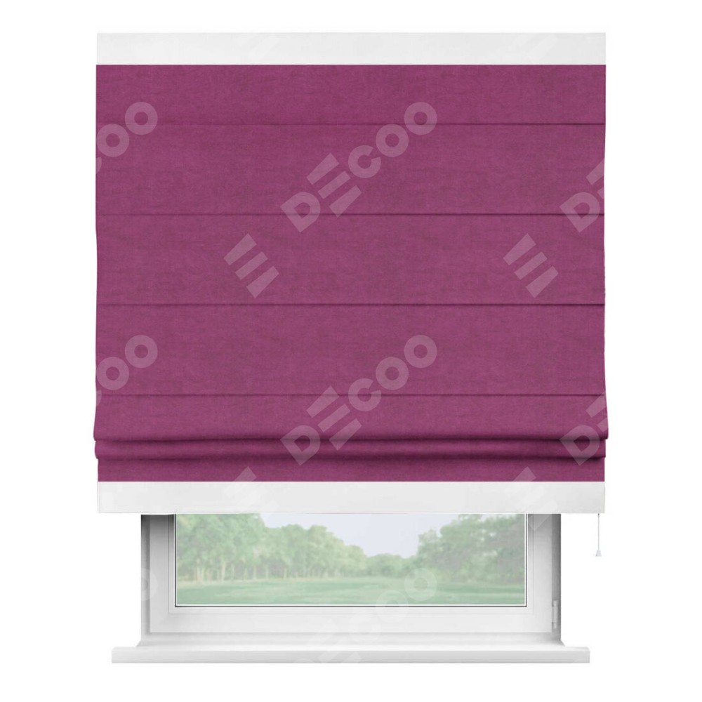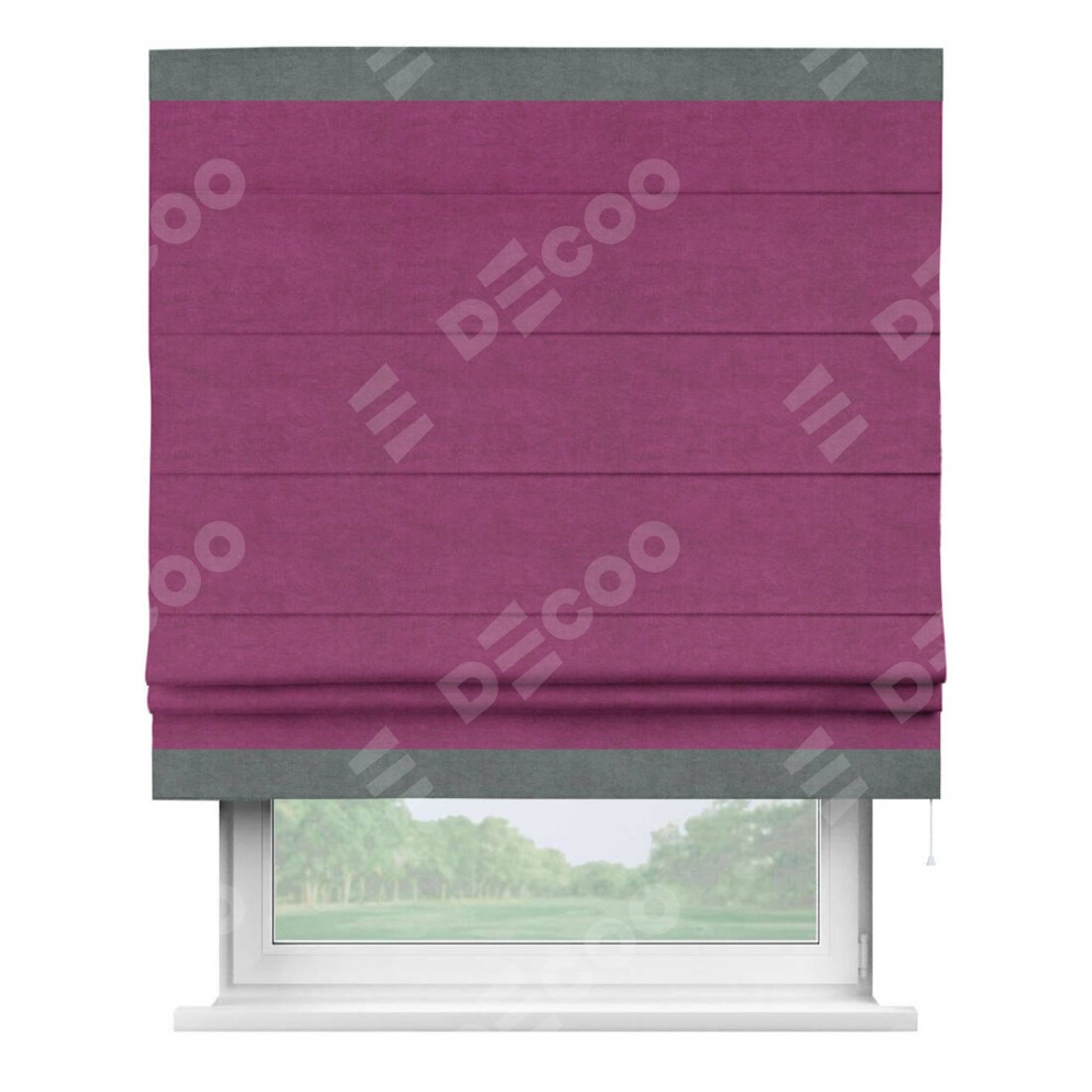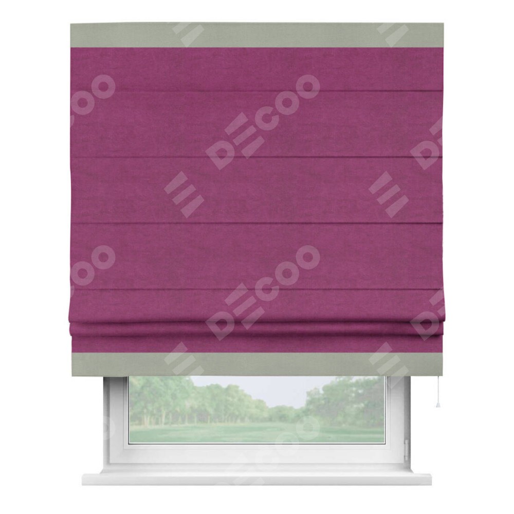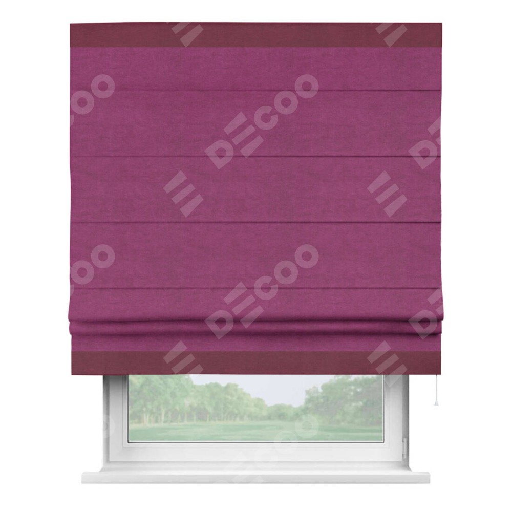 Римская штора производителя «Cortin», используется для проёма, пошита из ткани вельвет фиолетовый, артикул ткани 85552. Отделка шторы кантом «Горизонт», ткань для канта используется из вельвета разной расцветки на выбор. Имеет универсальный механизм и подходит для монтажа: на потолок, на стену и в нишу.