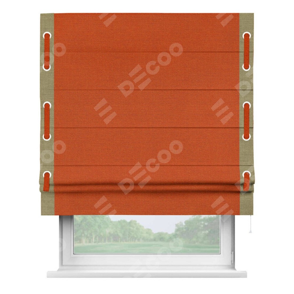 Римская штора производителя «Cortin», используется для проёма, пошита из ткани лён терракотовый, артикул 53440. Отделка шторы кантом «Стрим Дуо» на кантах расположены люверсы с пояском, ткань для канта используется из льна разной расцветки на выбор. Ткань для пояска обычно используется из основной ткани шторы, а так же можно сделать из любой расцветки по желанию. Имеет универсальный механизм и подходит для монтажа: на потолок, на стену и в нишу.