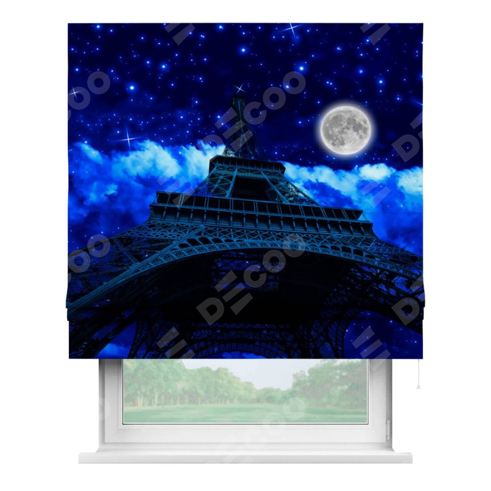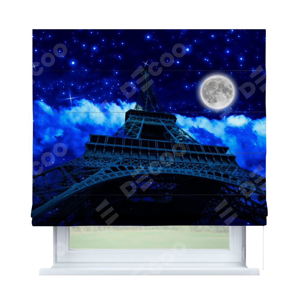 Римская штора производителя «Cortin», используется для проёма, пошита из ткани блэкаут с нанесением сублимационной печати «Ночь в Париже». Имеет универсальный механизм и подходит для монтажа: на потолок, на стену и в нишу.
