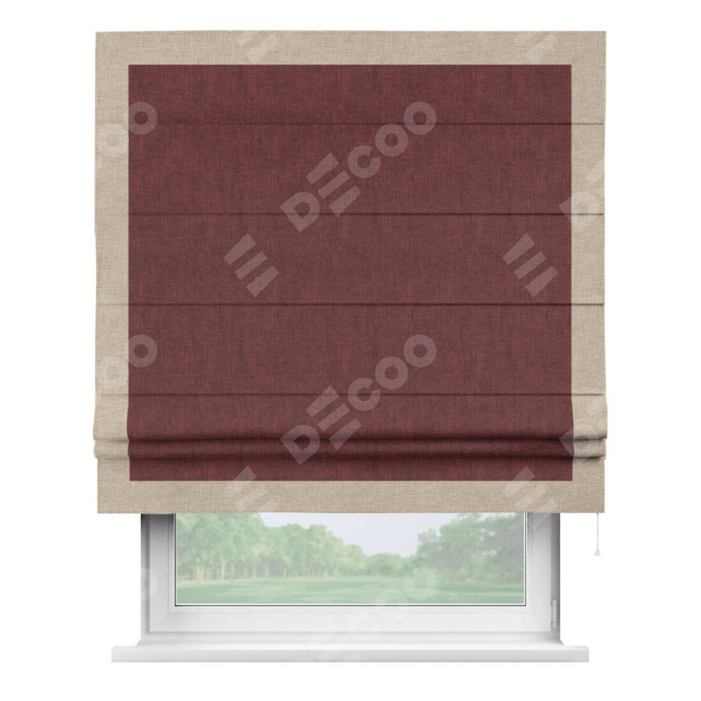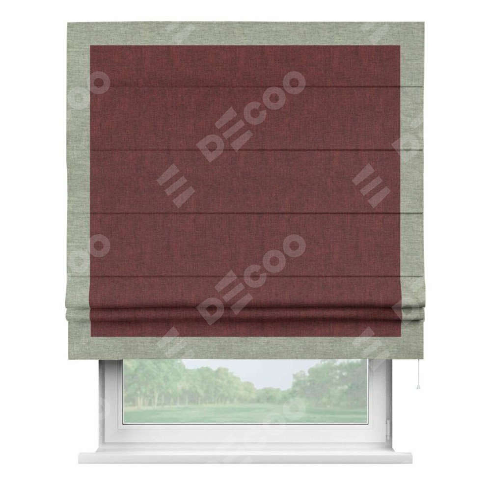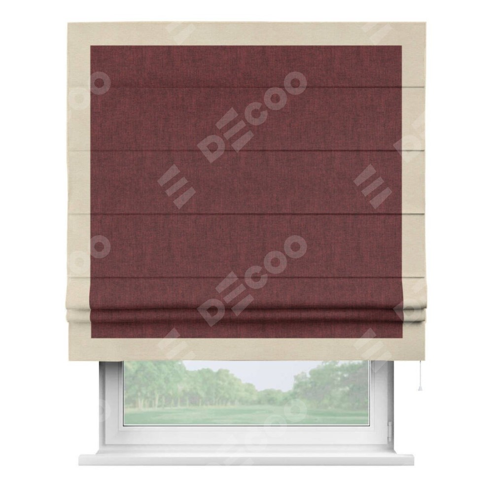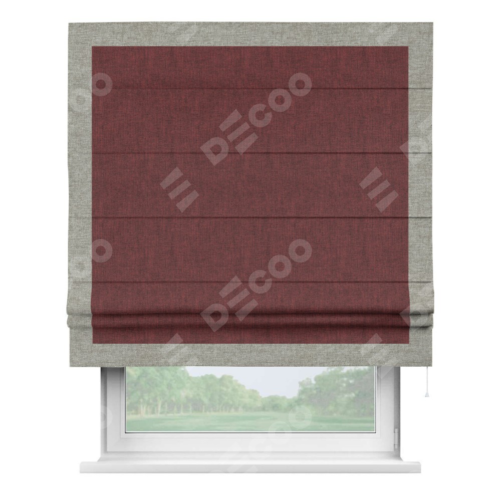 Римская штора производителя «Cortin», используется для проёма, пошита из ткани лён кашемир бордовый, артикул 17213. Отделка шторы кантом «Чесс», ткань для канта используется из льна разной расцветки на выбор. Имеет универсальный механизм и подходит для монтажа: на потолок, на стену и в нишу.