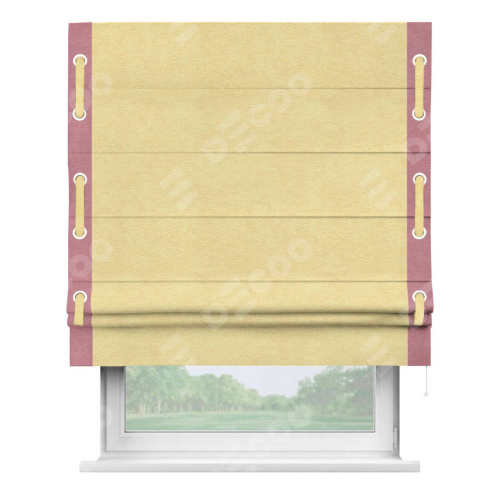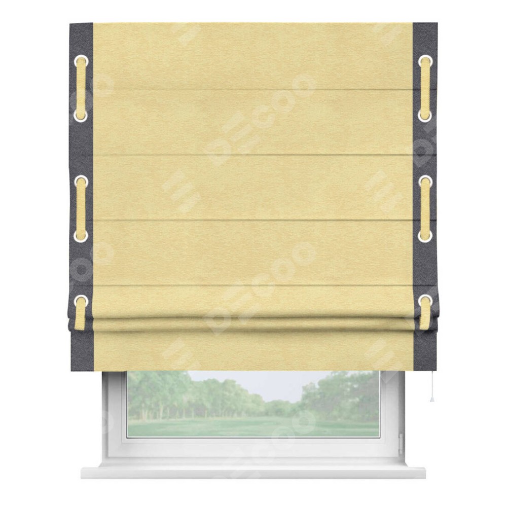 Римская штора производителя «Cortin», используется для проёма, пошита из ткани софт однотонный золотой, артикул 42934. Отделка шторы кантом «Стрим Дуо» на кантах расположены люверсы с пояском, ткань для канта используется из софта разной расцветки на выбор. Ткань для пояска обычно используется из основной ткани шторы, а так же можно сделать из любой расцветки по желанию. Имеет универсальный механизм и подходит для монтажа: на потолок, на стену и в нишу.