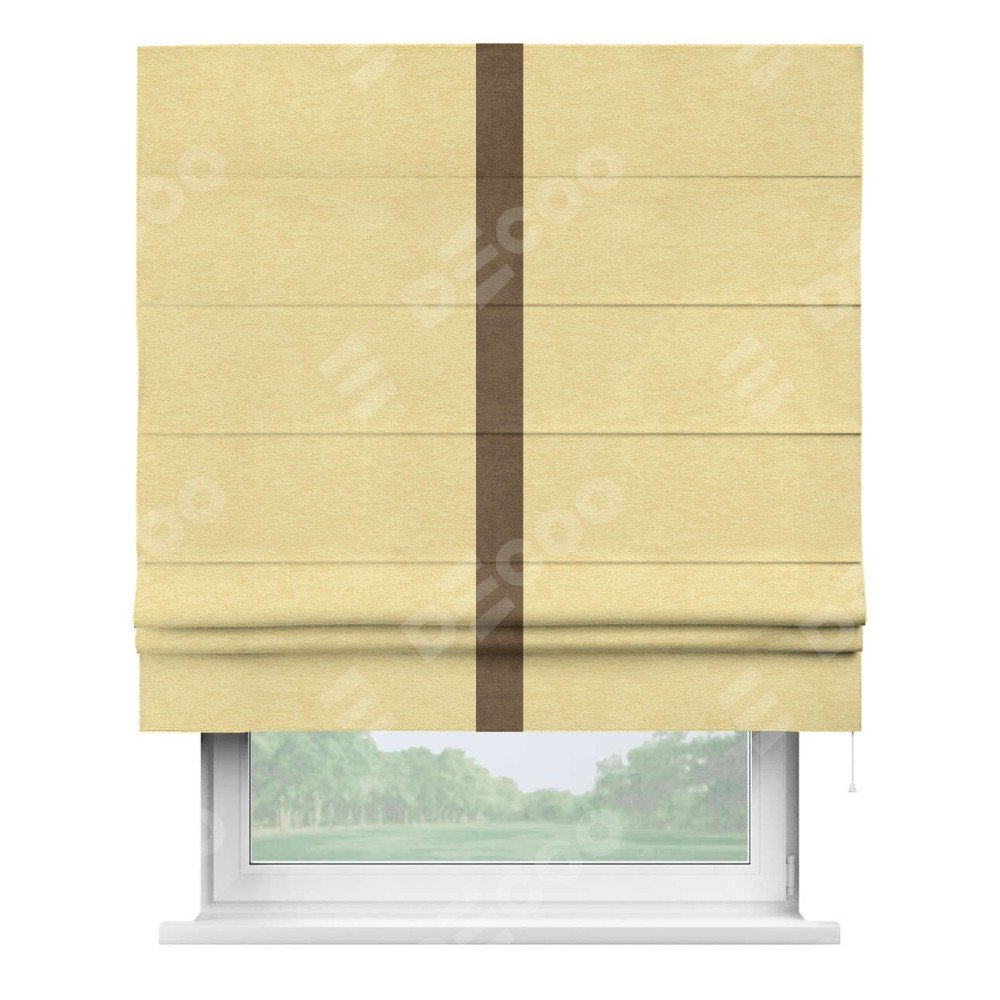Римская штора производителя «Cortin», используется для проёма, пошита из ткани софт однотонный золотой, артикул 42934. Отделка шторы кантом «Хайвэй», ткань для канта используется из софта разной расцветки на выбор. Имеет универсальный механизм и подходит для монтажа: на потолок, на стену и в нишу.