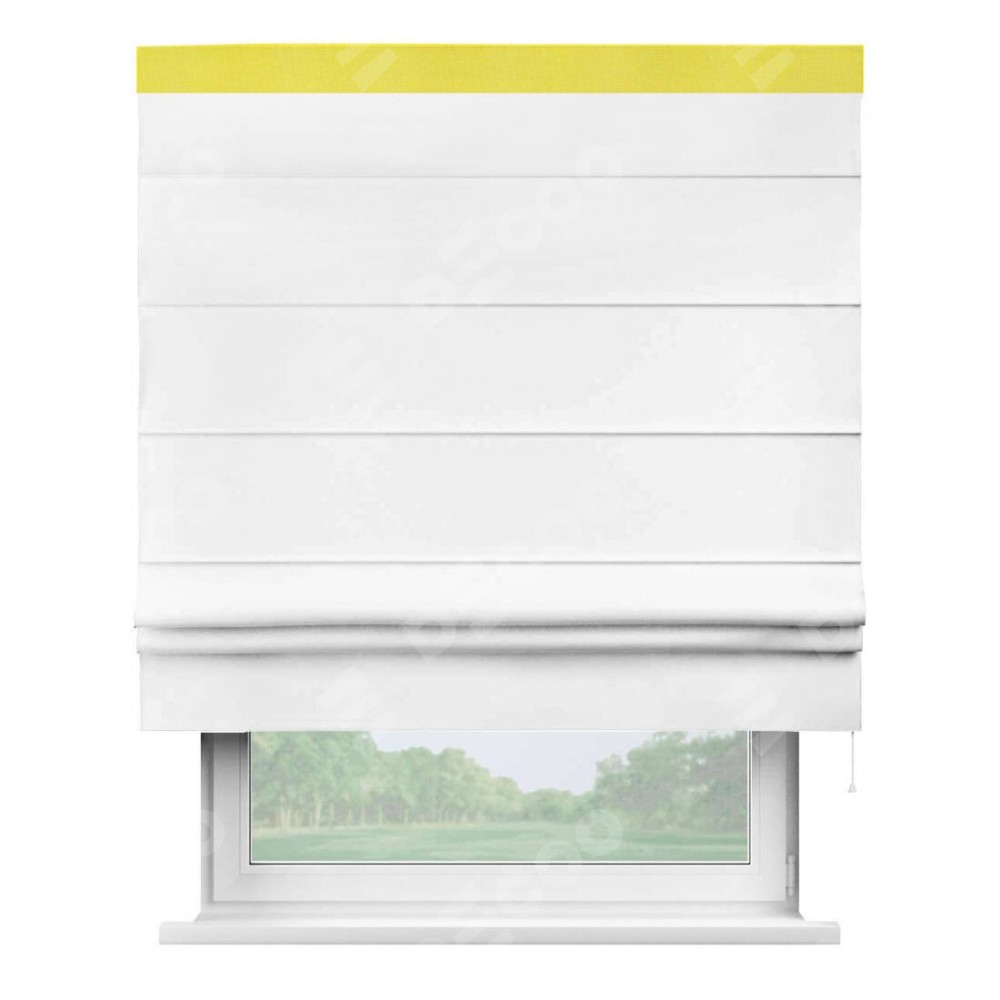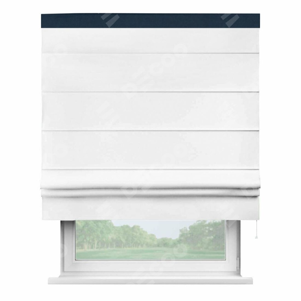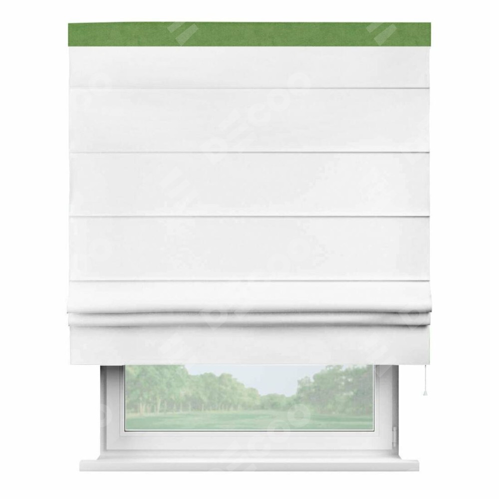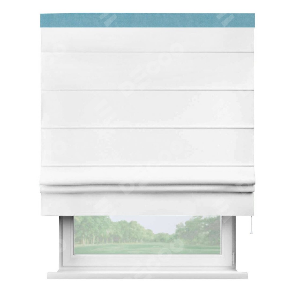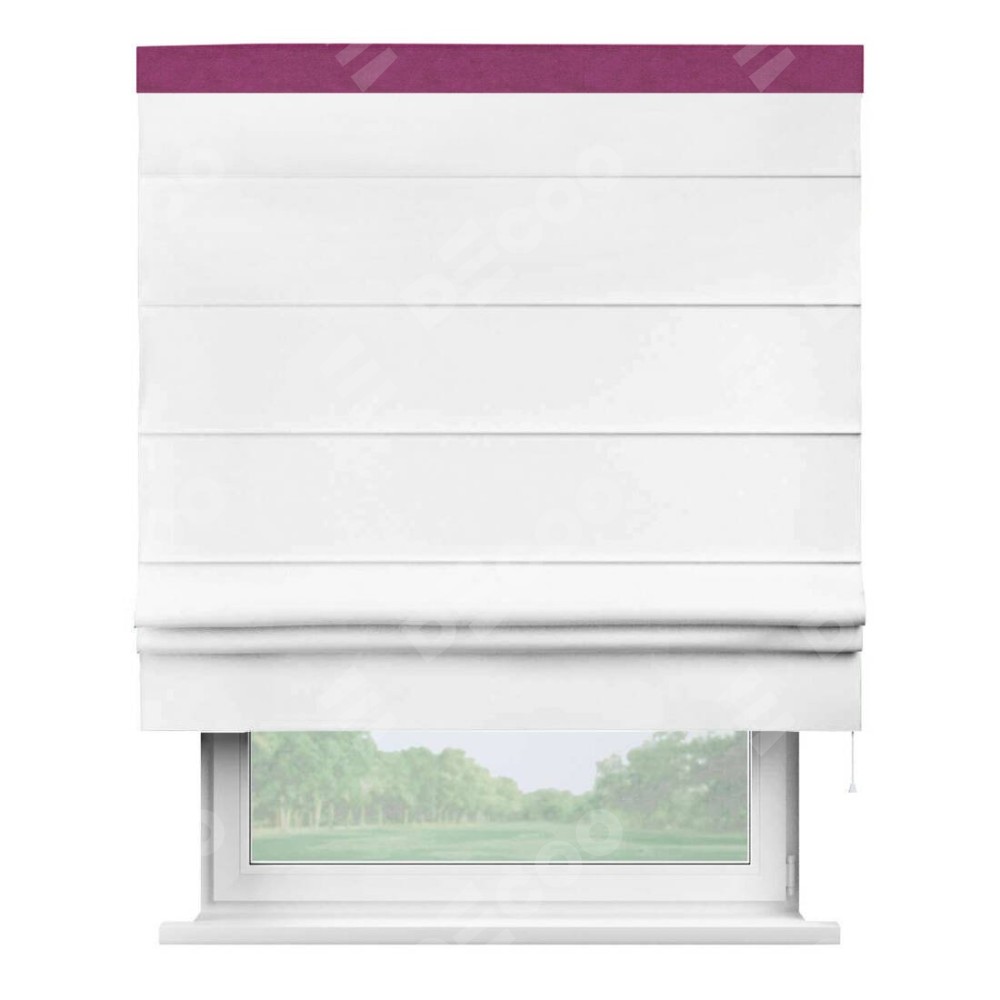 Римская штора производителя «Cortin», используется для проёма, пошита из ткани вельвет белоснежный, артикул ткани 19192. Отделка шторы кантом «Кинг», ткань для канта используется из вельвета разной расцветки на выбор. Имеет универсальный механизм и подходит для монтажа: на потолок, на стену и в нишу.