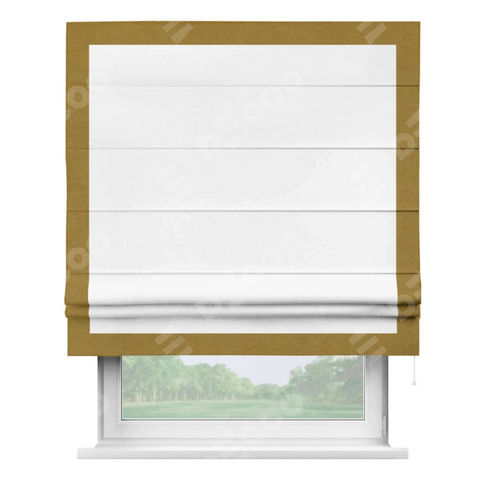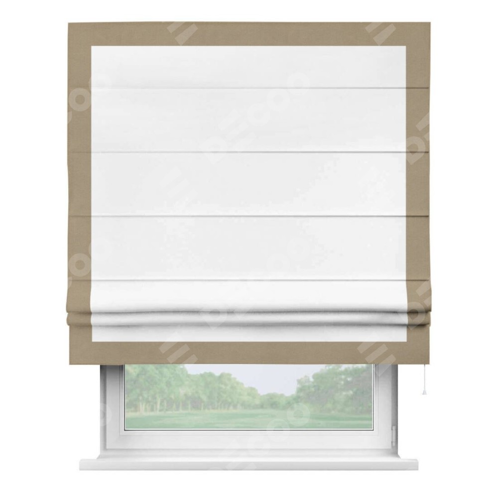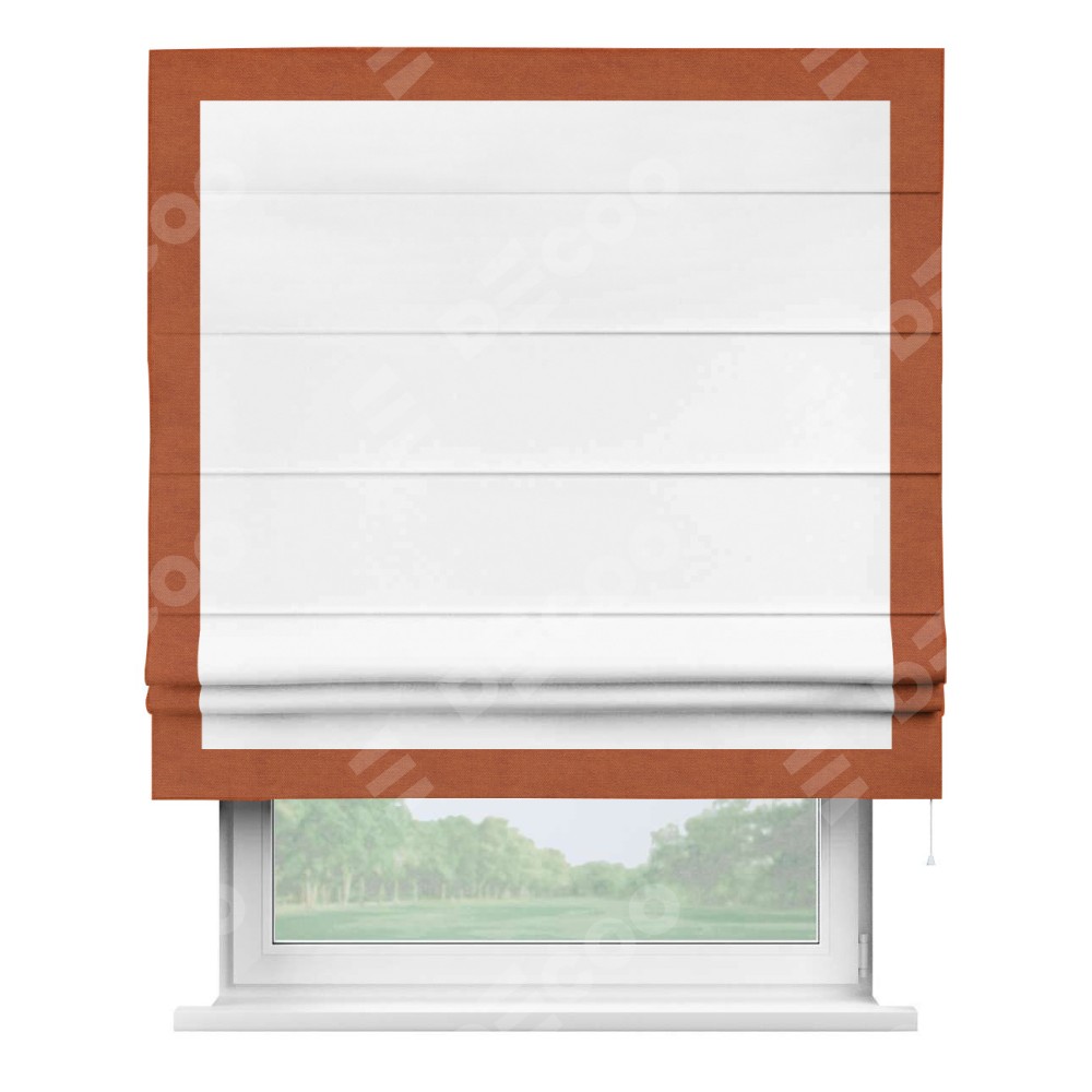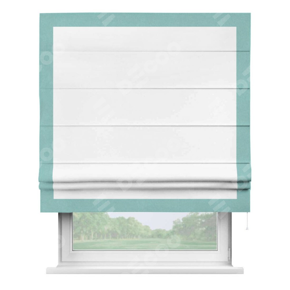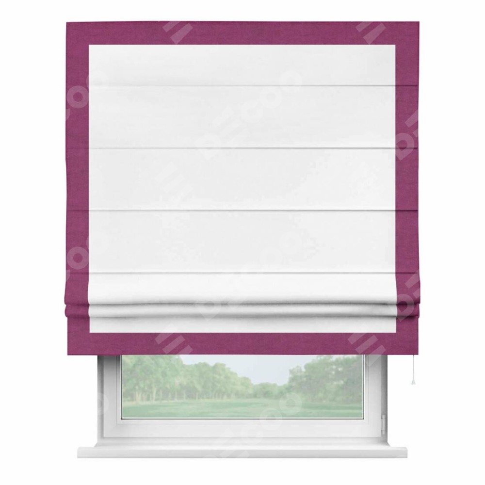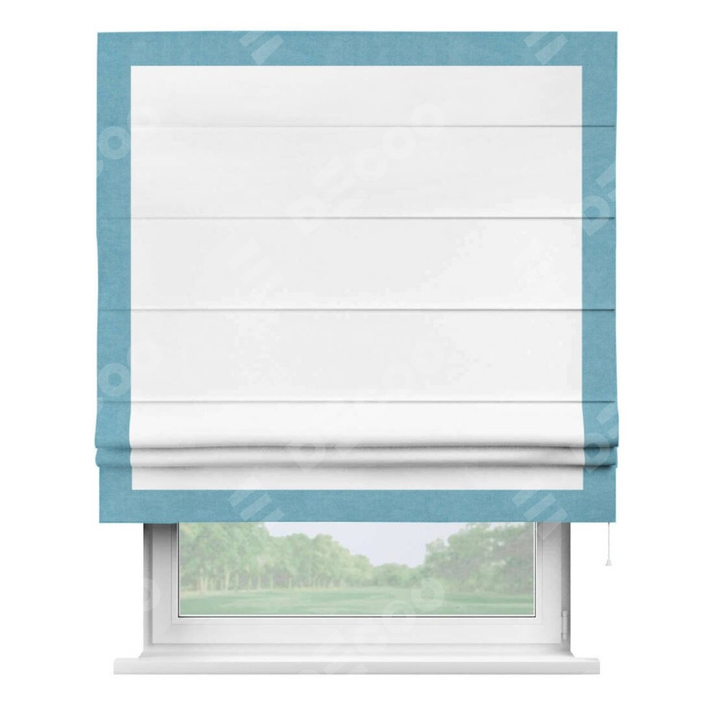 Римская штора производителя «Cortin», используется для проёма, пошита из ткани вельвет белоснежный, артикул ткани 19192. Отделка шторы кантом «Чесс», ткань для канта используется из вельвета разной расцветки на выбор. Имеет универсальный механизм и подходит для монтажа: на потолок, на стену и в нишу.