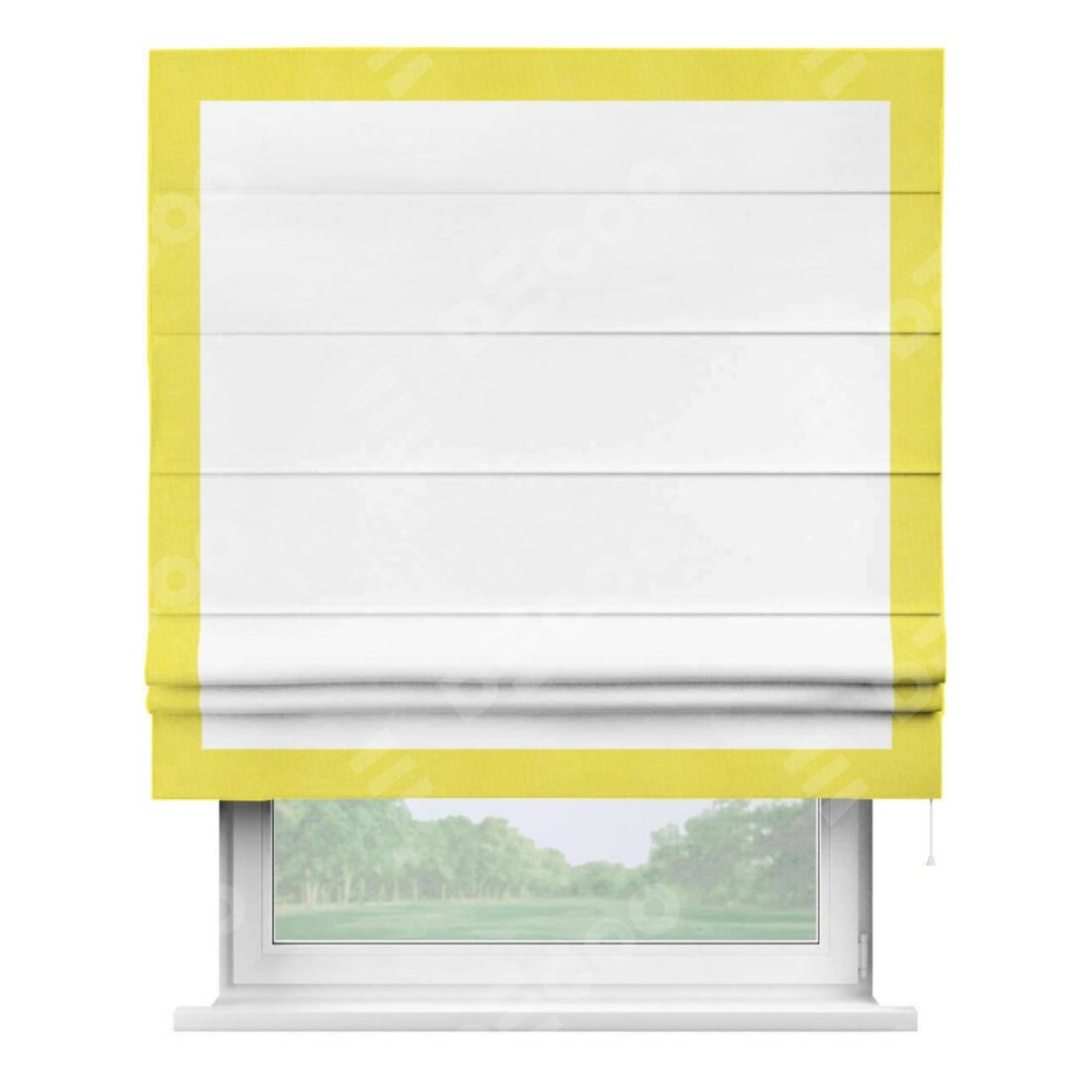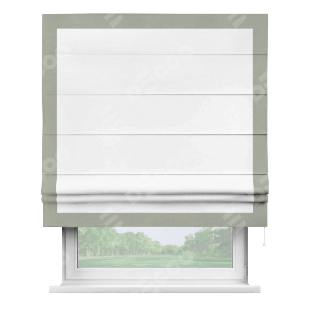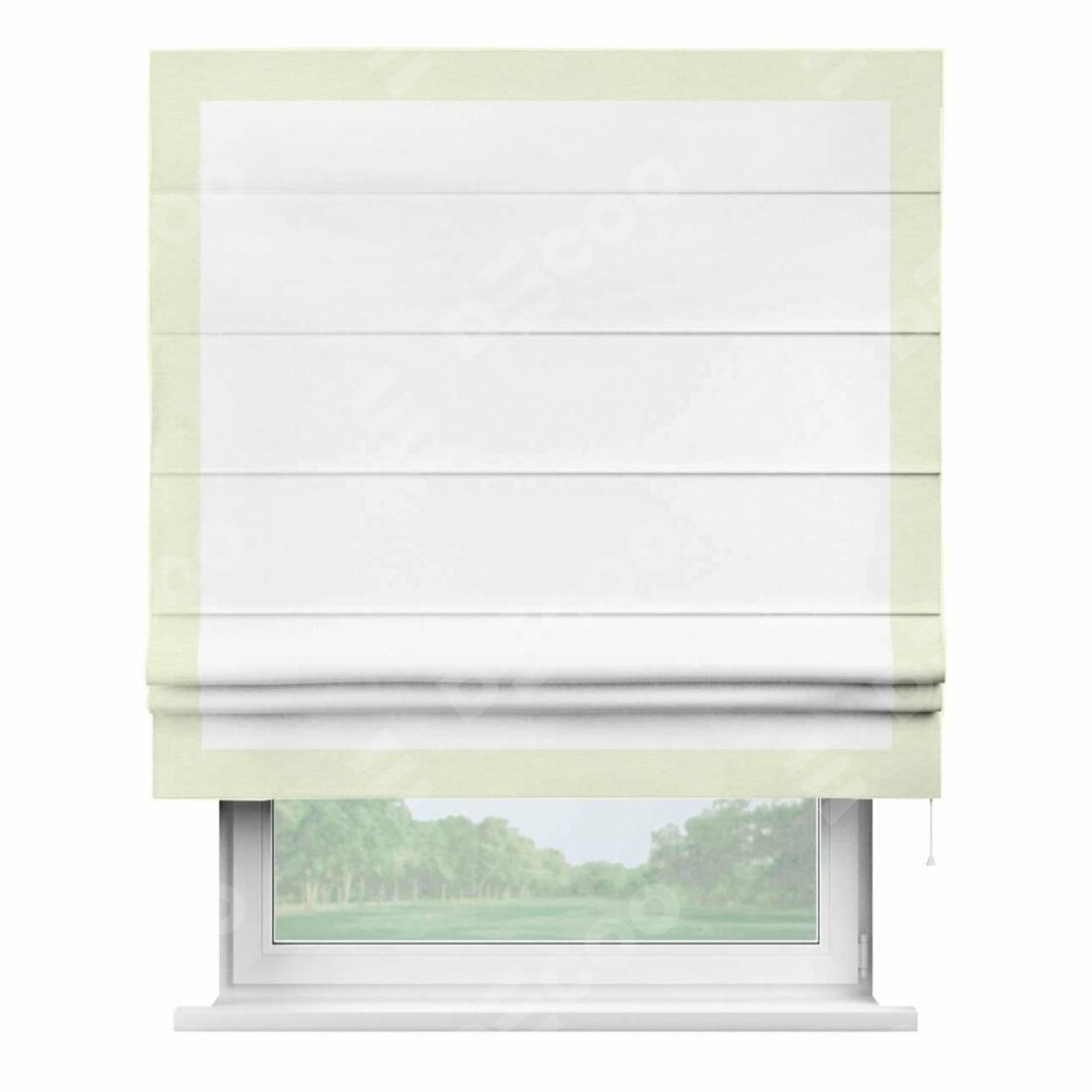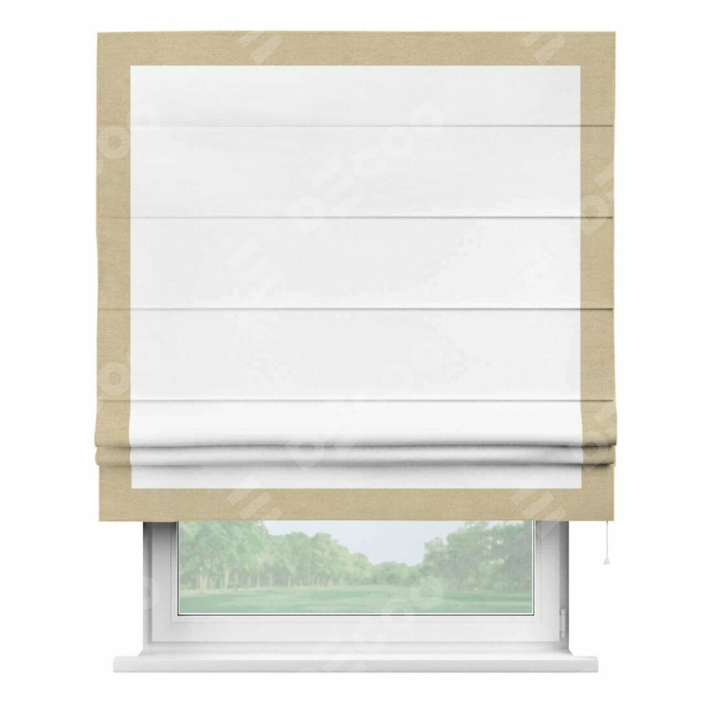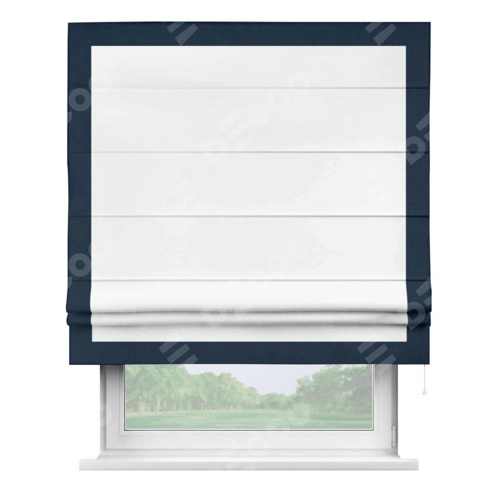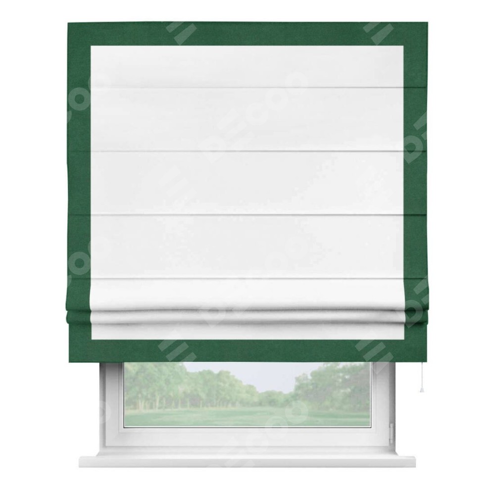Римская штора производителя «Cortin», используется для проёма, пошита из ткани вельвет белоснежный, артикул ткани 19192. Отделка шторы кантом «Чесс», ткань для канта используется из вельвета разной расцветки на выбор. Имеет универсальный механизм и подходит для монтажа: на потолок, на стену и в нишу.