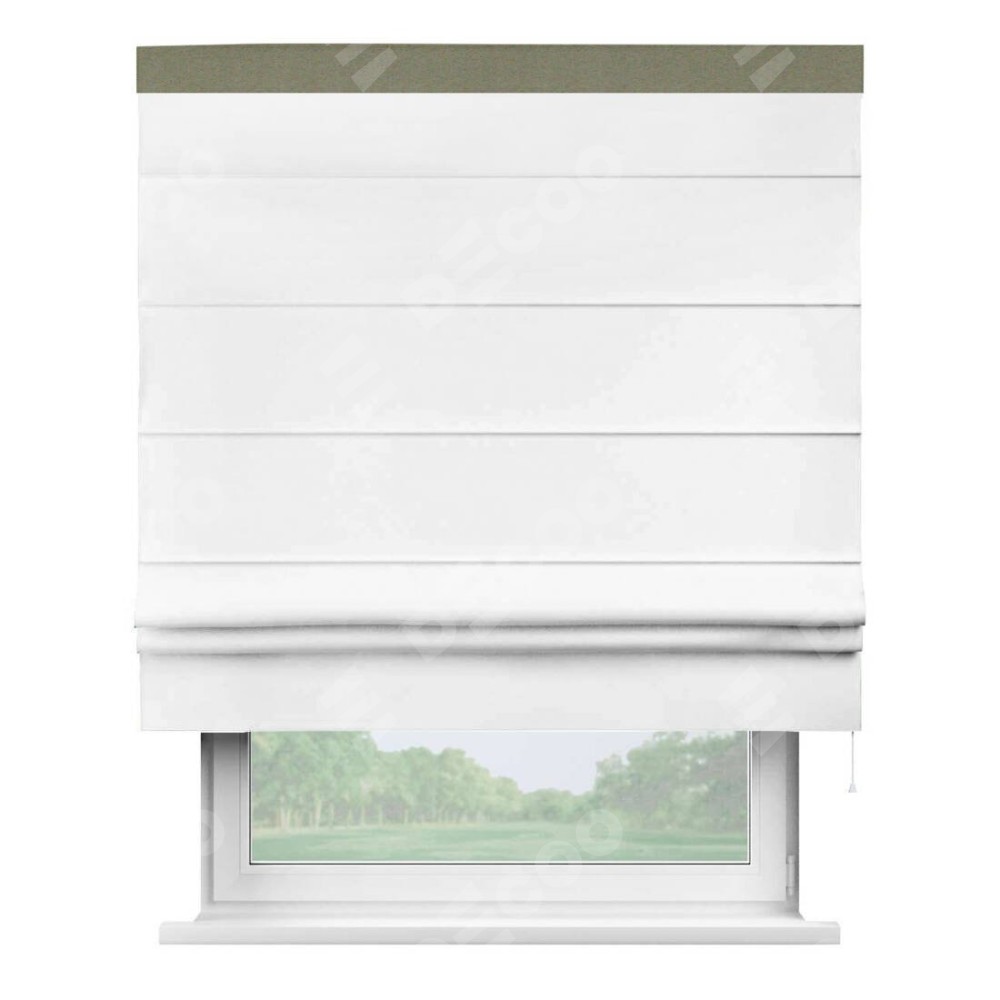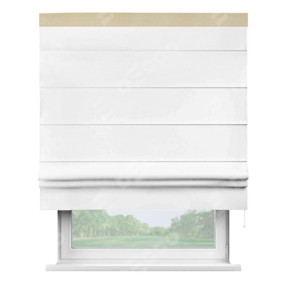 Римская штора производителя «Cortin», используется для проёма, пошита из ткани однотонная белоснежная, артикул ткани 41217. Отделка шторы кантом «Кинг», ткань для канта используется из блэкаута однотонного разной расцветки на выбор. Имеет универсальный механизм и подходит для монтажа: на потолок, на стену и в нишу.
