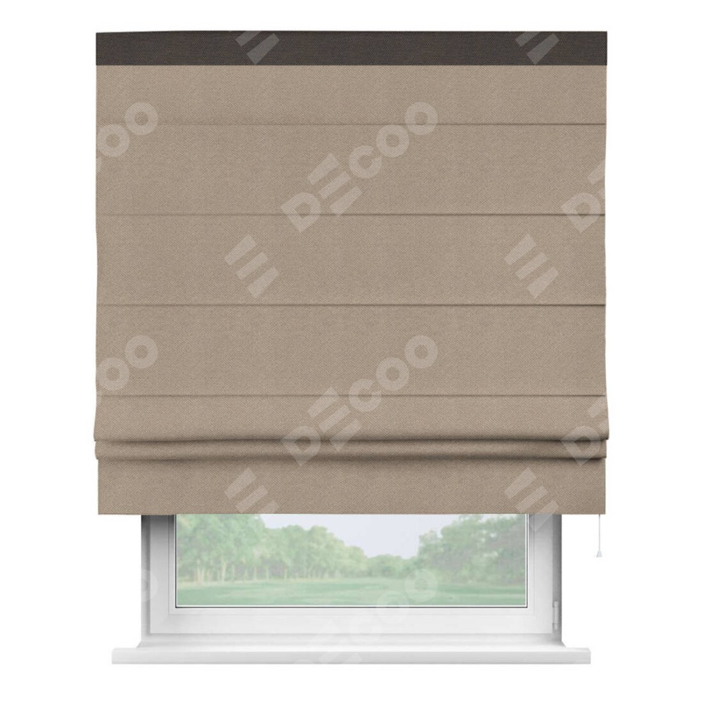 Римская штора производителя «Cortin», используется для проёма, пошита из ткани лён димаут светло-бежевый, артикул 00002. Отделка шторы кантом «Кинг», ткань для канта используется из льна димаут разной расцветки на выбор. Имеет универсальный механизм и подходит для монтажа: на потолок, на стену и в нишу.