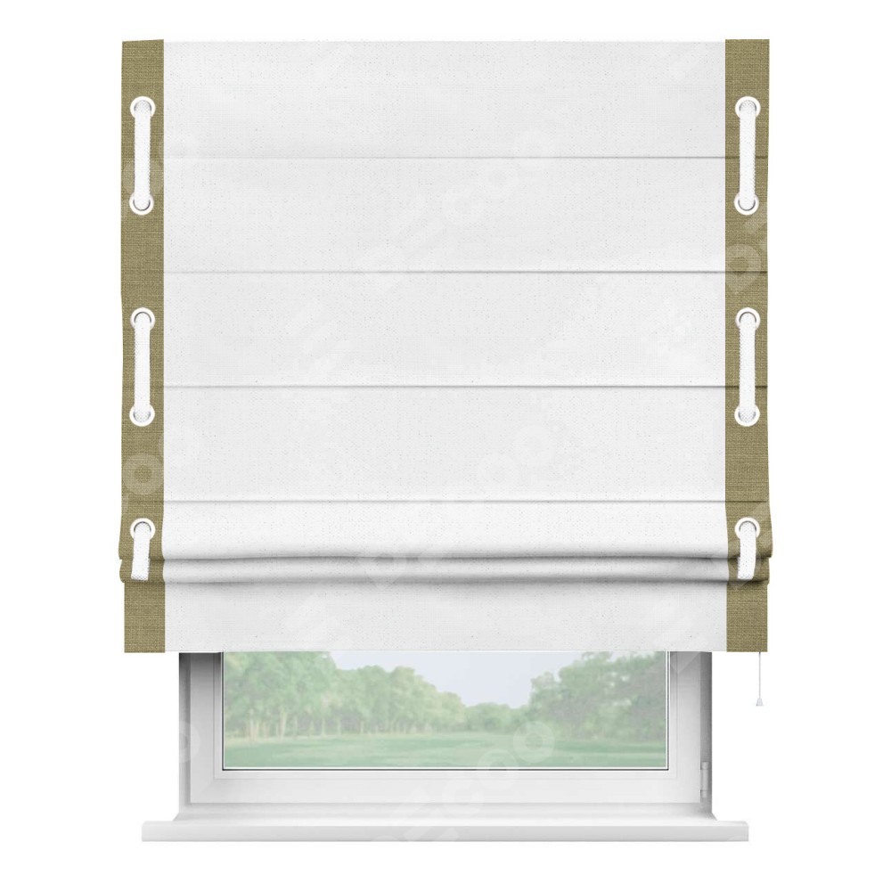 Римская штора производителя «Cortin», используется для проёма, пошита из ткани лён белый, артикул 7439. Отделка шторы кантом «Стрим Дуо» на кантах расположены люверсы с пояском, ткань для канта используется из льна разной расцветки на выбор. Ткань для пояска обычно используется из основной ткани шторы, а так же можно сделать из любой расцветки по желанию. Имеет универсальный механизм и подходит для монтажа: на потолок, на стену и в нишу.