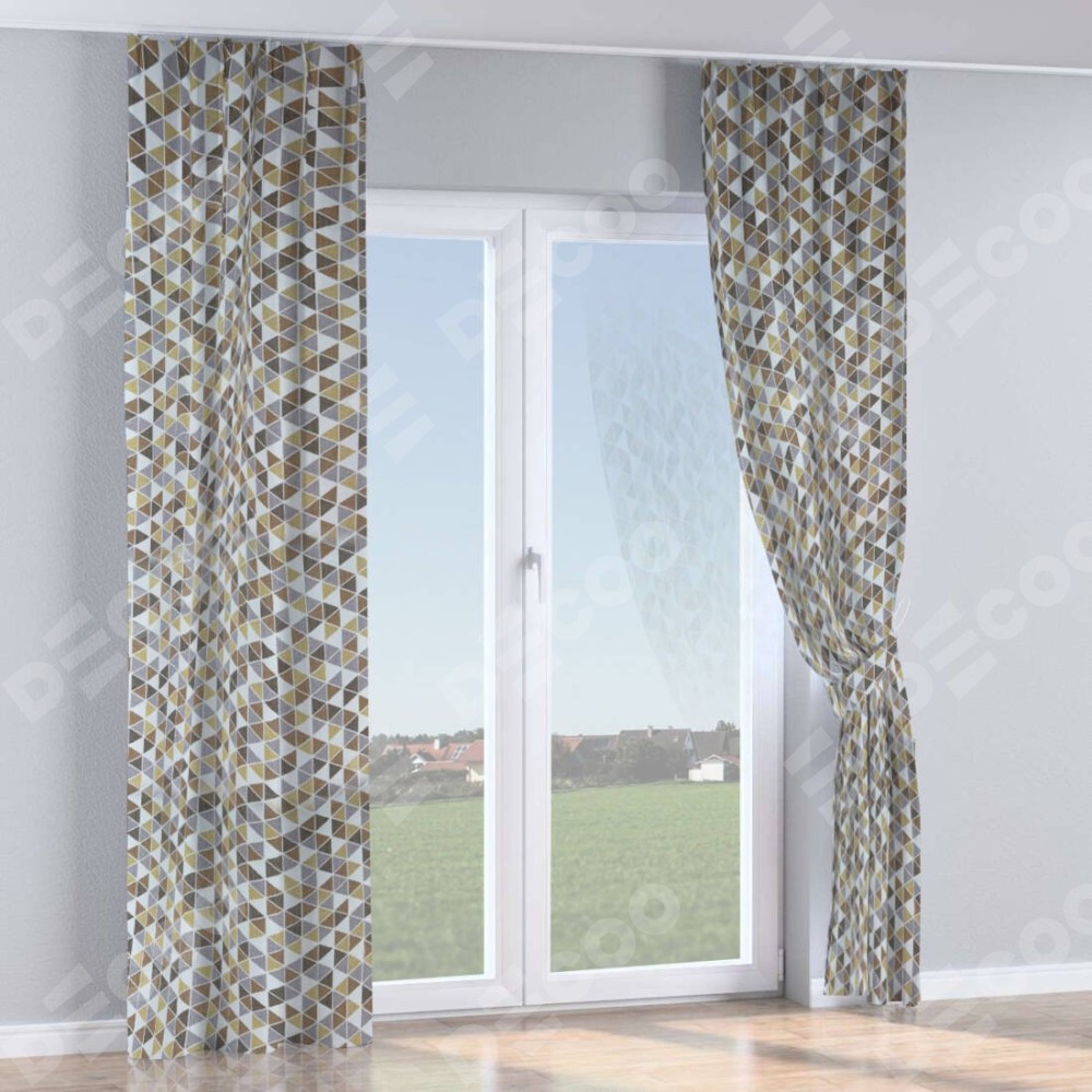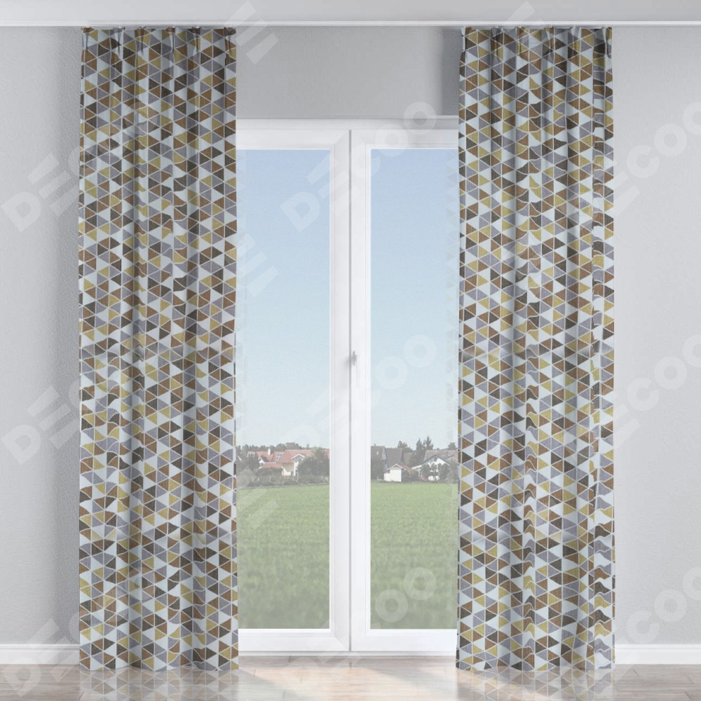 Комплект прямых штор, от производителя «Cortin», пошиты из ткани димаут «Треугольники коричневые», артикул ткани 23021. С изнаночной стороны в верхней части штор пристрачивается шторная лента с декоративными складками «Кустик». Для создания элегантных складок прямые шторы шьются по стандарту с коэффициентом 1:2 (на 100 см. ширины проёма 200 см. ширины ткани).