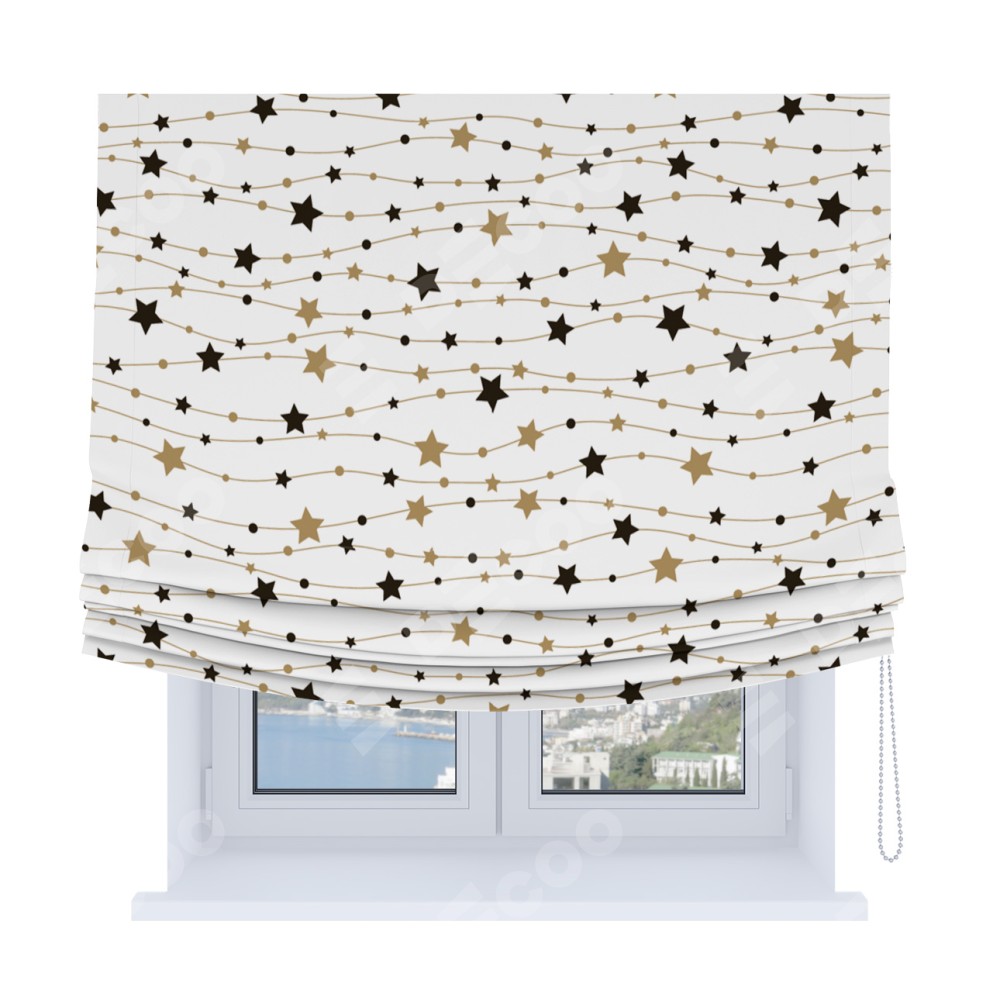 Римская штора Soft производителя «Cortin», используется для проёма, пошита из ткани блэкаут с нанесением сублимационной печати «Звёздная нить». Имеет универсальный механизм и подходит для монтажа: на потолок, на стену и в нишу. В отличие от стандартных римских штор, римская штора Soft не имеет горизонтальных вставок и нижнего отвеса. Это позволяет ткани произвольно драпироваться в свободные мягкие складки.