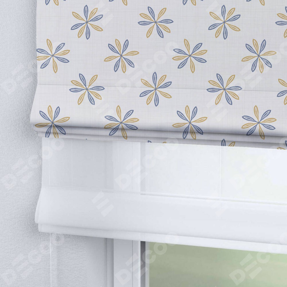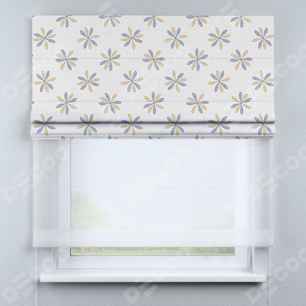 Римская штора день-ночь производителя «Cortin», используется для проёма, пошита из двух полотен, с лицевой блэкаут с нанесением сублимационной печати «Ромашки кантри», вторая ткань тюль (по стандарту комплектуется тюль белого цвета артикул V-01). Имеет универсальный механизм и подходит для монтажа: на потолок, на стену и в нишу.