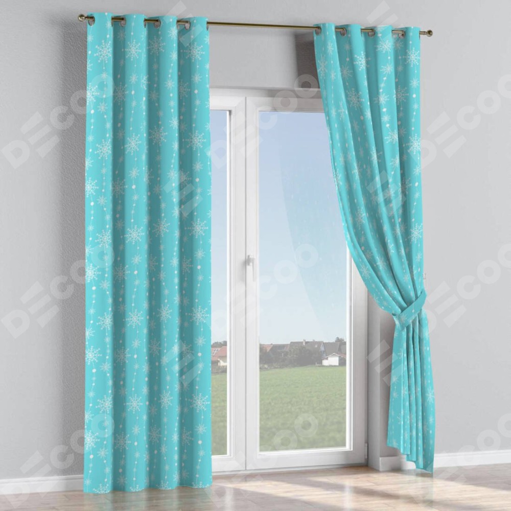 Комплект прямых штор, от производителя «Cortin», пошиты из ткани блэкаут с нанесением сублимационной печати «Гирлянда из снежинок». Данная модель пошита на люверсах, комплектуется на выбор круглым карнизом и подходит для монтажа на стену или потолок. Прямые шторы на люверсах шьются по стандарту с коэффициентом 1/2 (на 100 см. ширины проёма 200 см. ширины ткани), отличительным преимуществом данной модели является простой способ монтажа. Достаточно повесить ее на трубу и штора готова!