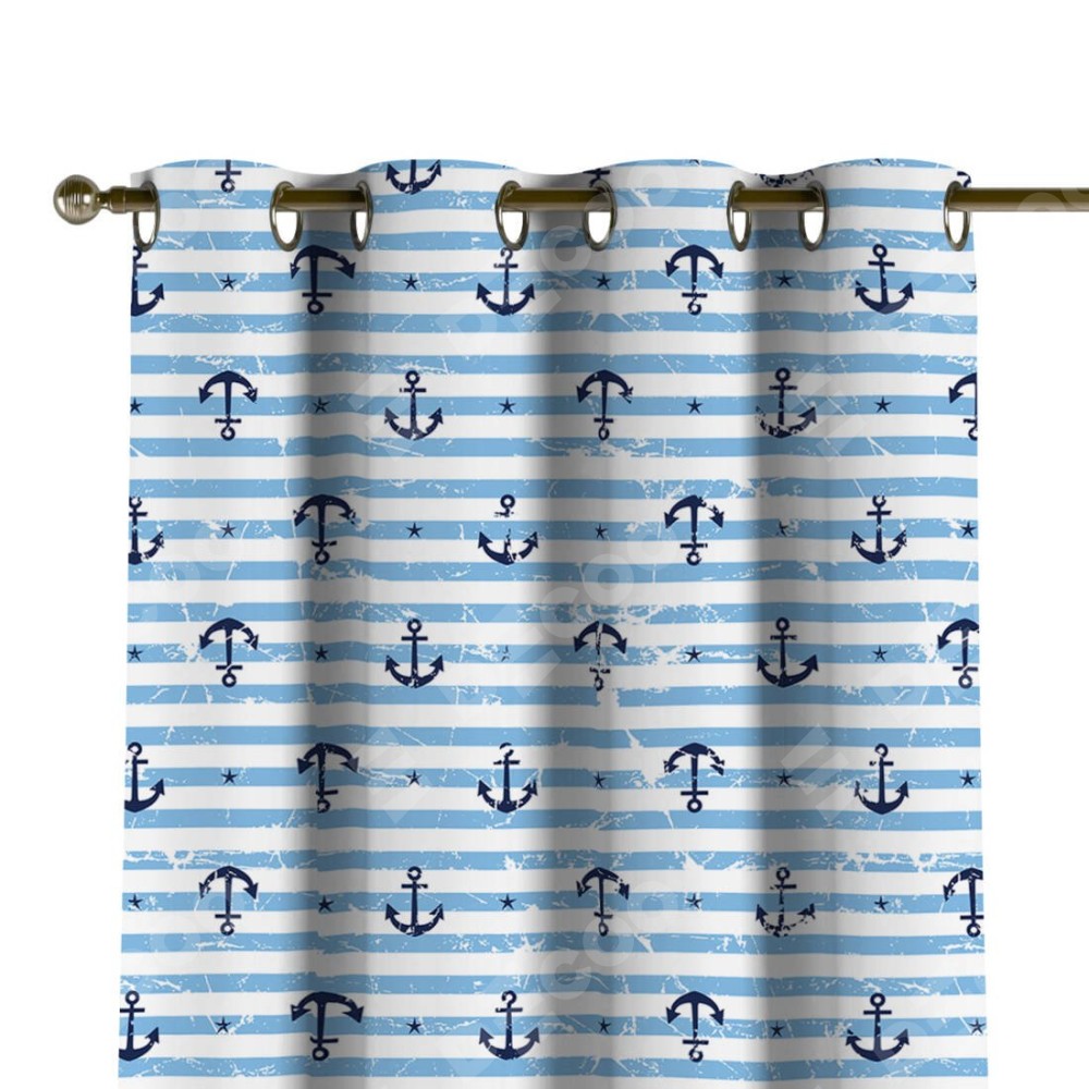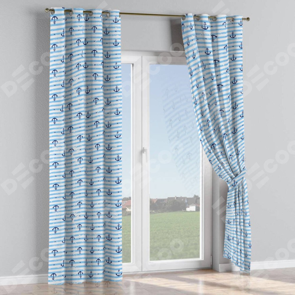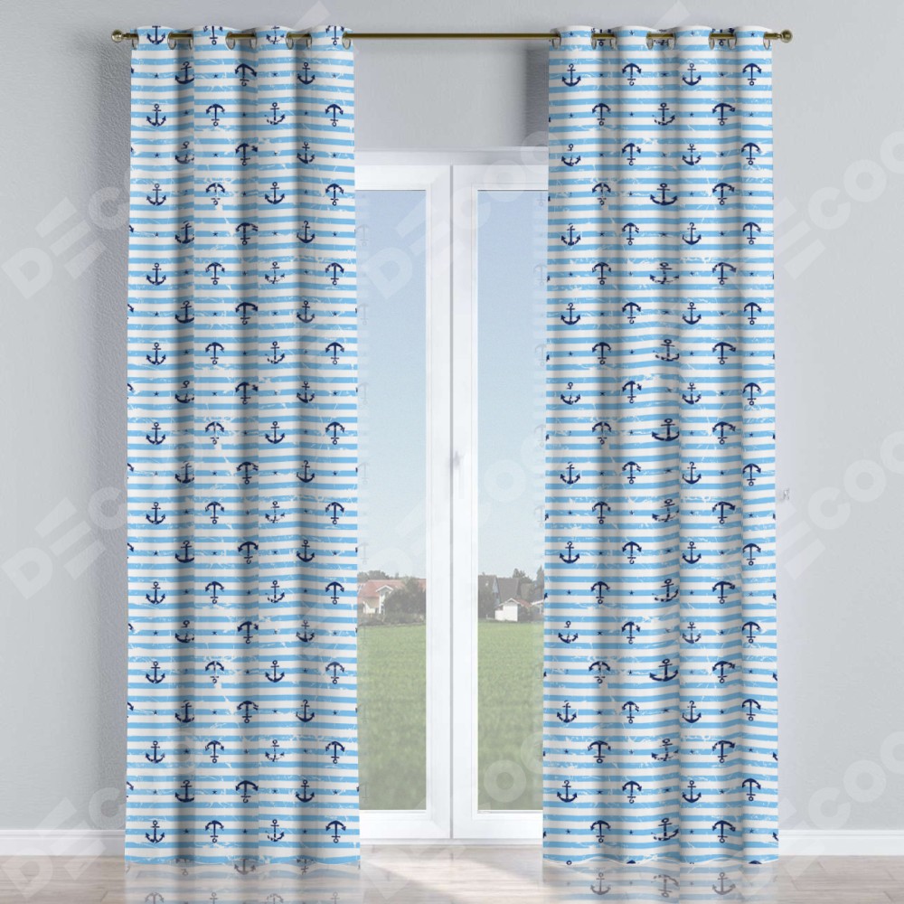 Комплект прямых штор, от производителя «Cortin», пошиты из ткани блэкаут с нанесением сублимационной печати «Полоски и якори». Данная модель пошита на люверсах, комплектуется на выбор круглым карнизом и подходит для монтажа на стену или потолок. Прямые шторы на люверсах шьются по стандарту с коэффициентом 1/2 (на 100 см. ширины проёма 200 см. ширины ткани), отличительным преимуществом данной модели является простой способ монтажа. Достаточно повесить ее на трубу и штора готова!