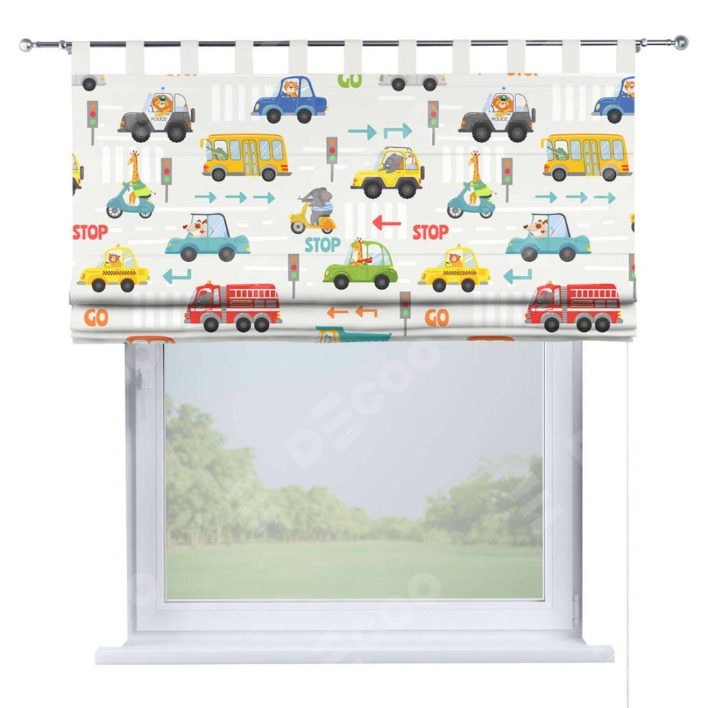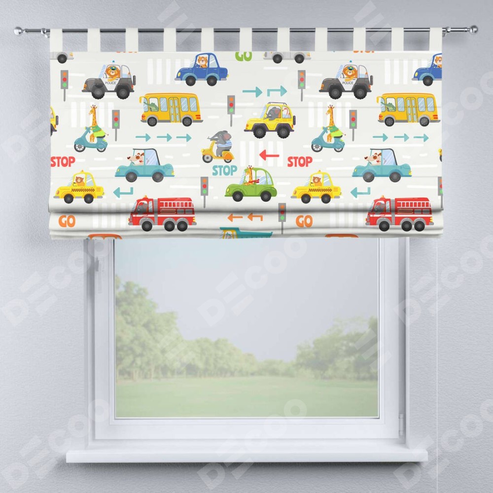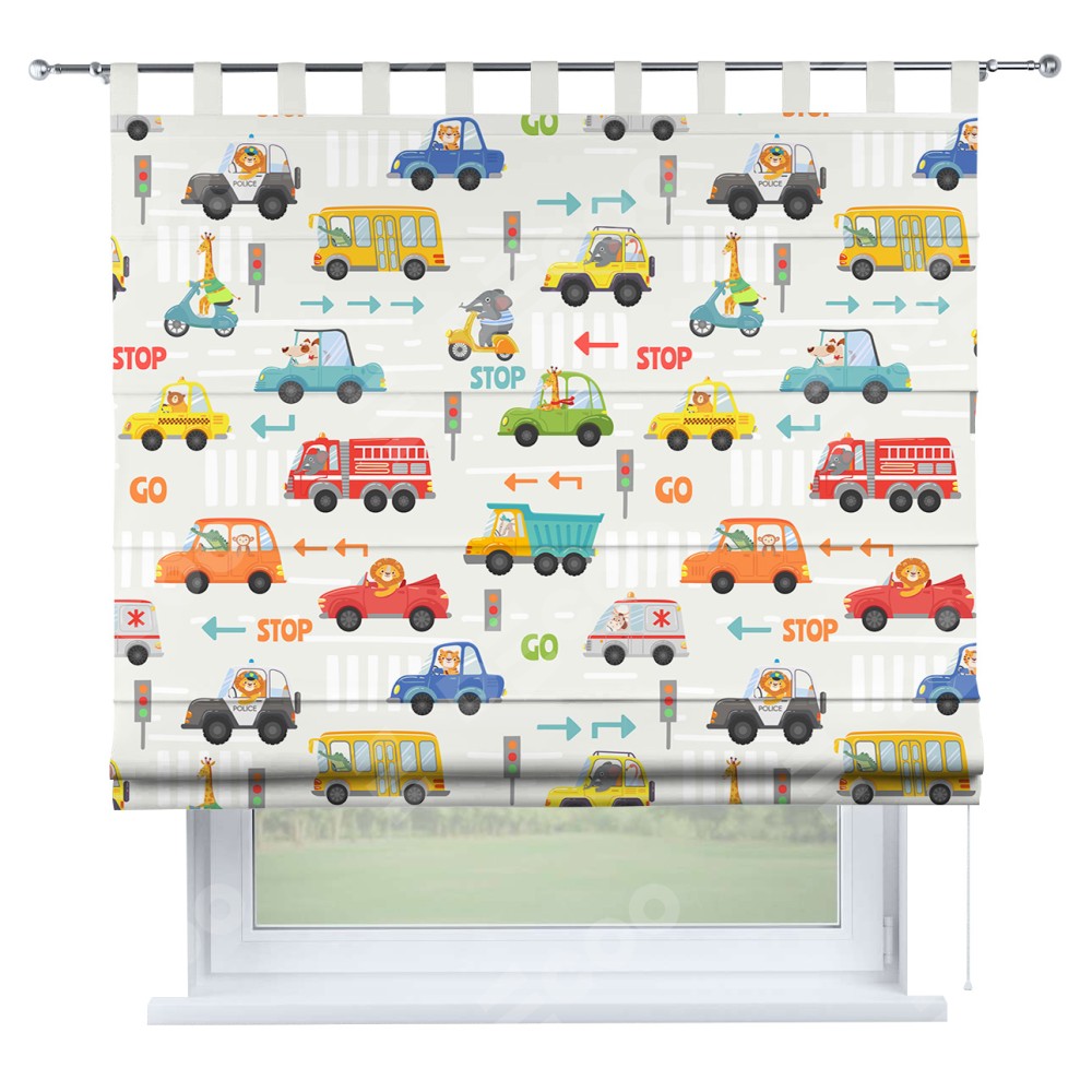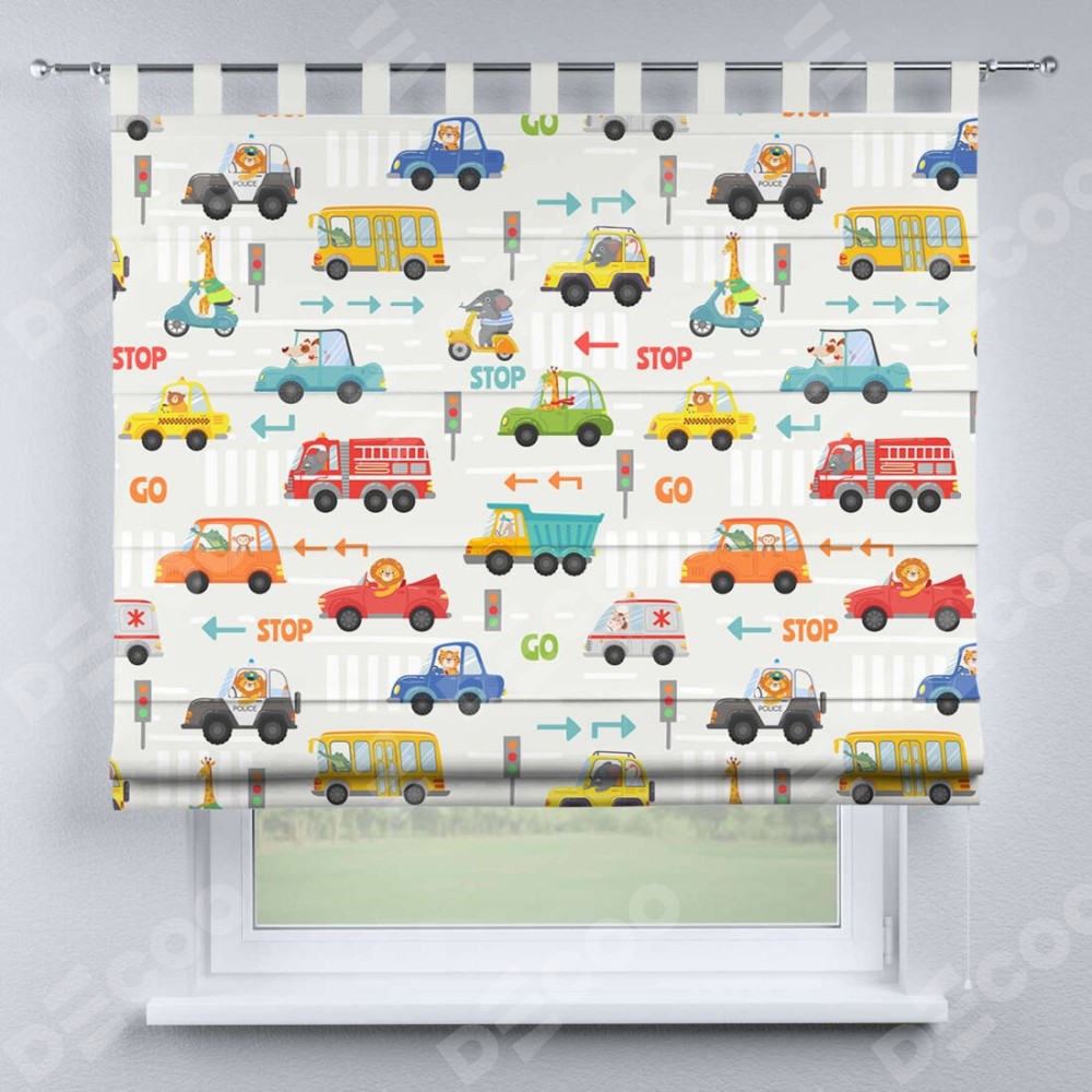 Римская штора производителя «Cortin», используется для проёма, пошита из ткани блэкаут с нанесением сублимационной печати «Дорожные правила». Данная модель пошита на петлях, комплектуется на выбор круглым карнизом и подходит для монтажа на стену. Римская штора на петлях имеет простую систему регулировки высоты, отличительным преимуществом данной модели является простой способ монтажа. Достаточно повесить ее на трубу и штора готова!