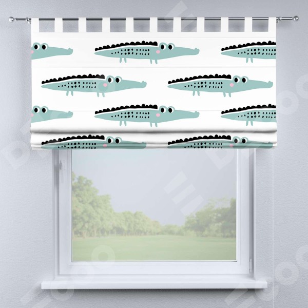 Римская штора производителя «Cortin», используется для проёма, пошита из ткани блэкаут с нанесением сублимационной печати «Мистер Крок». Данная модель пошита на петлях, комплектуется на выбор круглым карнизом и подходит для монтажа на стену. Римская штора на петлях имеет простую систему регулировки высоты, отличительным преимуществом данной модели является простой способ монтажа. Достаточно повесить ее на трубу и штора готова!