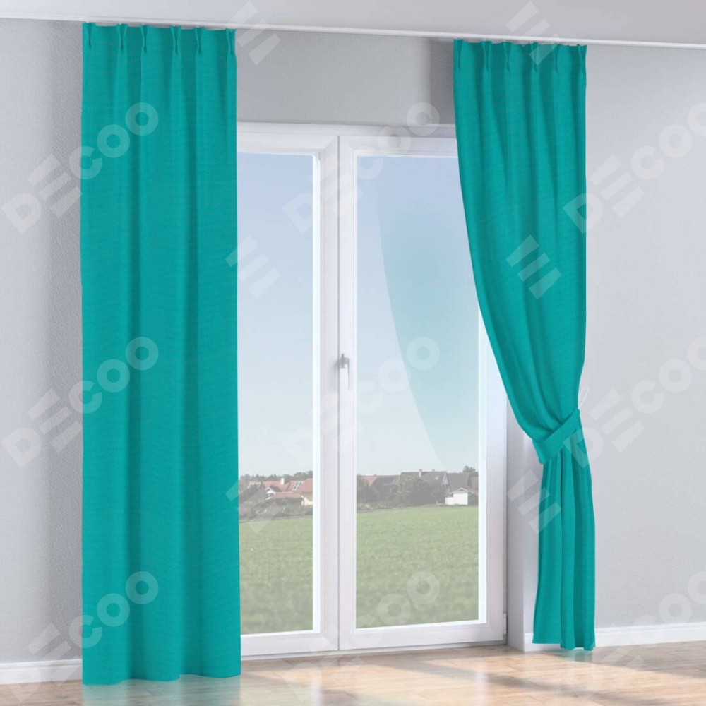 Комплект прямых штор, от производителя «Cortin», пошиты из ткани блэкаут однотонный бирюзовый, артикул ткани 88297. С изнаночной стороны в верхней части штор пристрачивается шторная лента с декоративными складками «Кустик». Для создания элегантных складок прямые шторы шьются по стандарту с коэффициентом 1:2 (на 100 см. ширины проёма 200 см. ширины ткани).