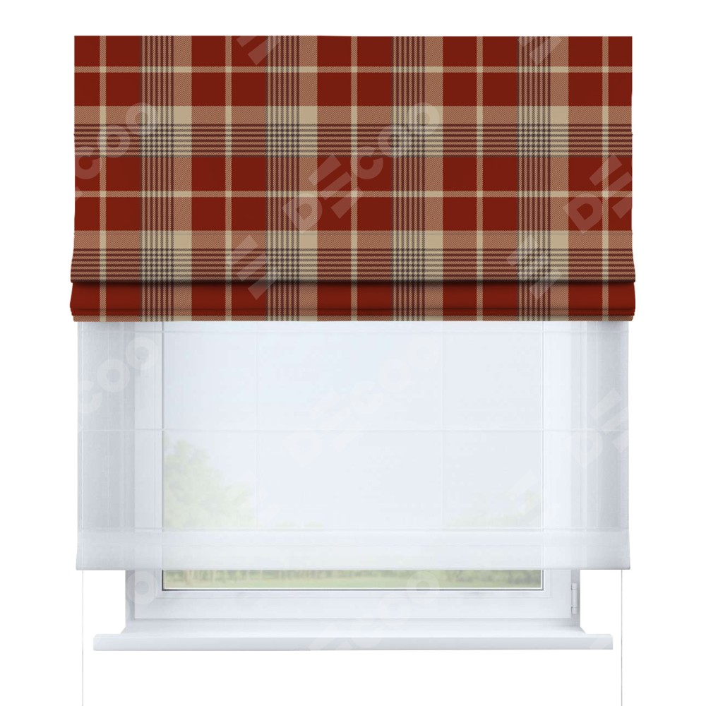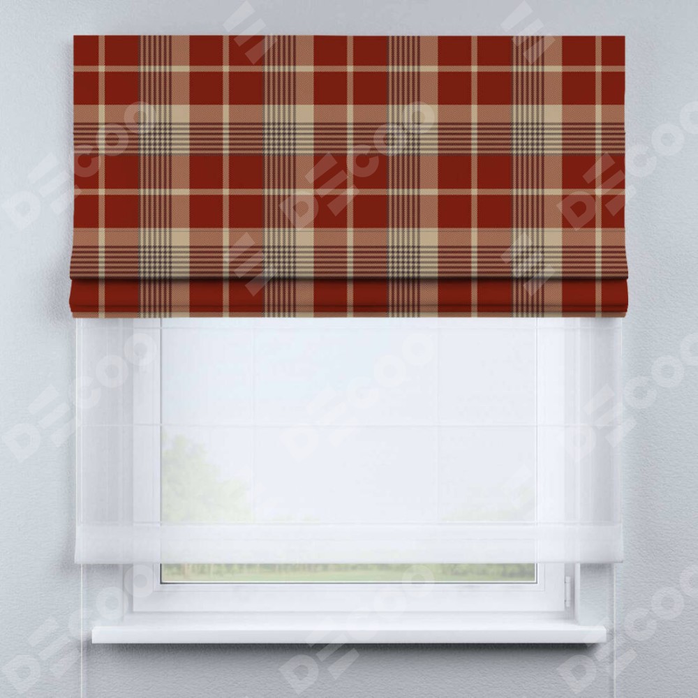 Римская штора день-ночь производителя «Cortin», используется для проёма, пошита из двух полотен, с лицевой блэкаут с нанесением сублимационной печати «Бежево-бордовая клетка», вторая ткань тюль (по стандарту комплектуется тюль белого цвета артикул V-01). Имеет универсальный механизм и подходит для монтажа: на потолок, на стену и в нишу.