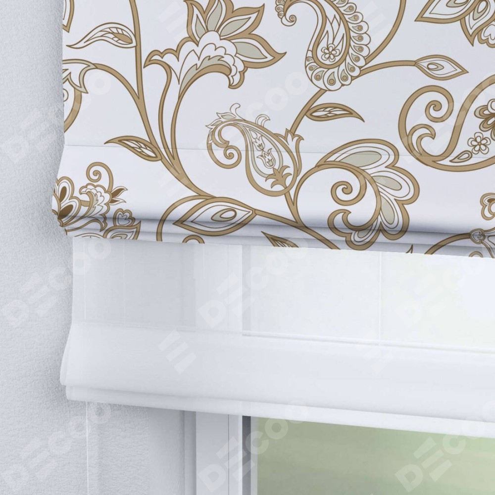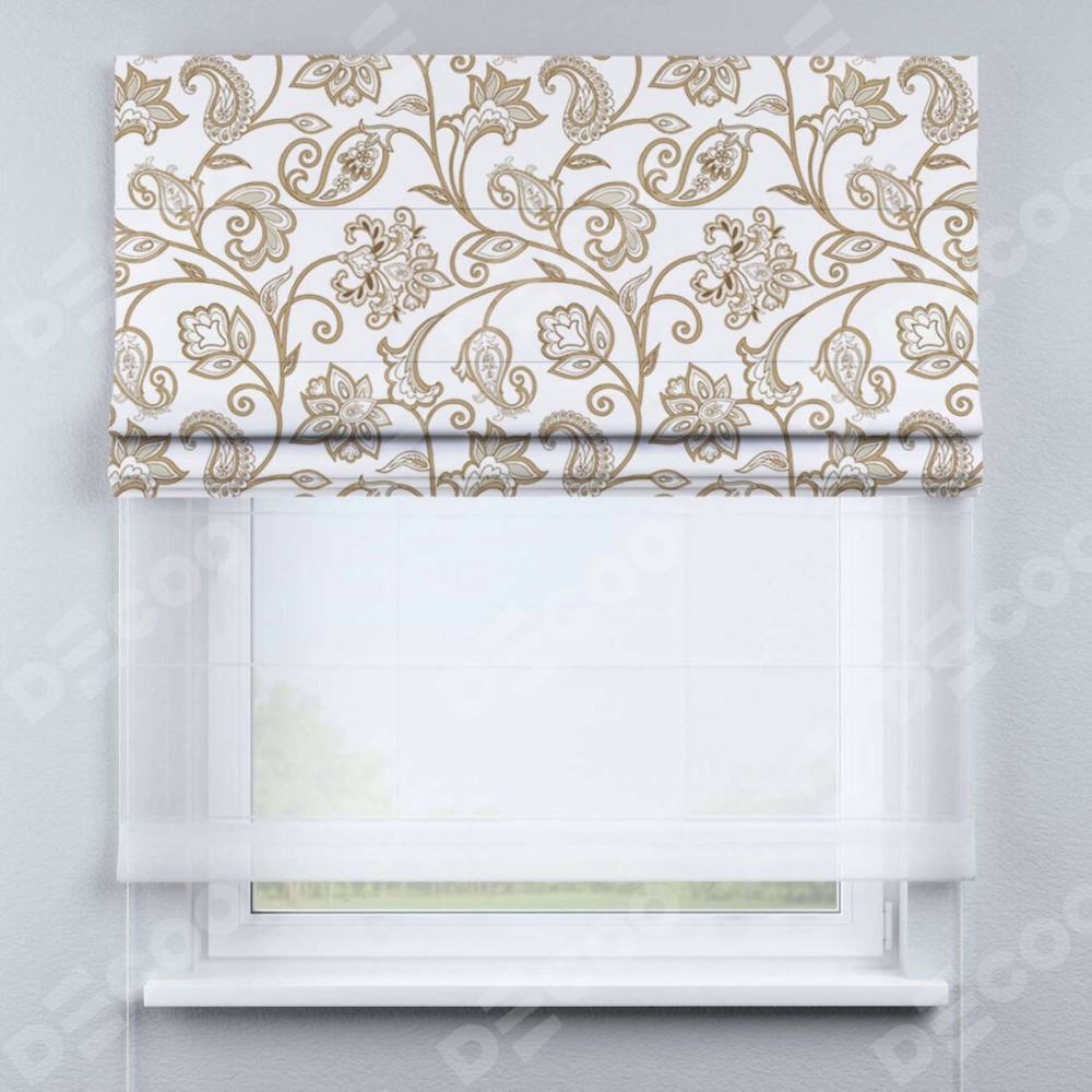 Римская штора день-ночь производителя «Cortin», используется для проёма, пошита из двух полотен, с лицевой блэкаут с нанесением сублимационной печати «Королевская роскошь», вторая ткань тюль (по стандарту комплектуется тюль белого цвета артикул V-01). Имеет универсальный механизм и подходит для монтажа: на потолок, на стену и в нишу.