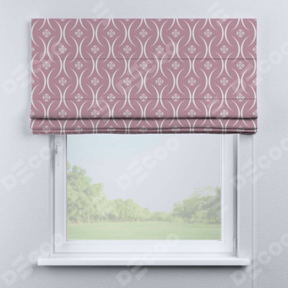 Римская штора производителя «Cortin», используется для проёма, пошита из ткани блэкаут с нанесением сублимационной печати «Воздушный узор розовый». Имеет универсальный механизм и подходит для монтажа: на потолок, на стену и в нишу.